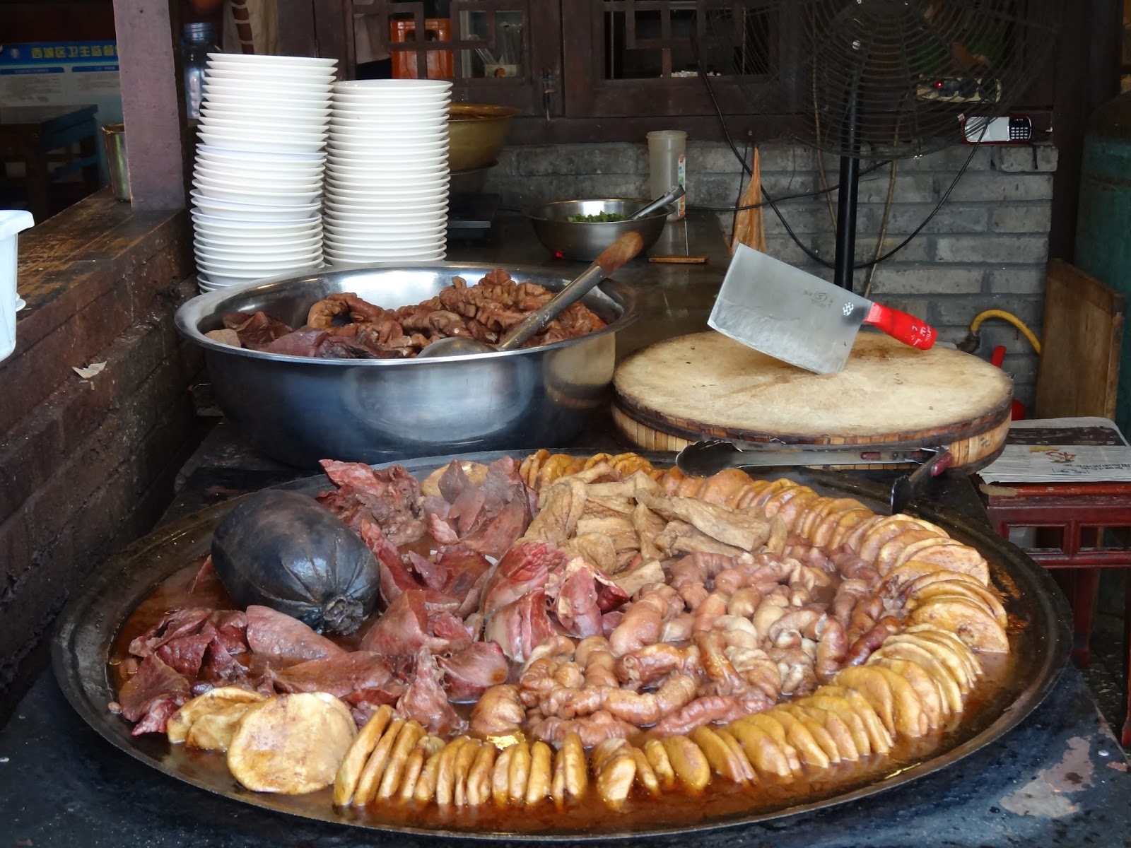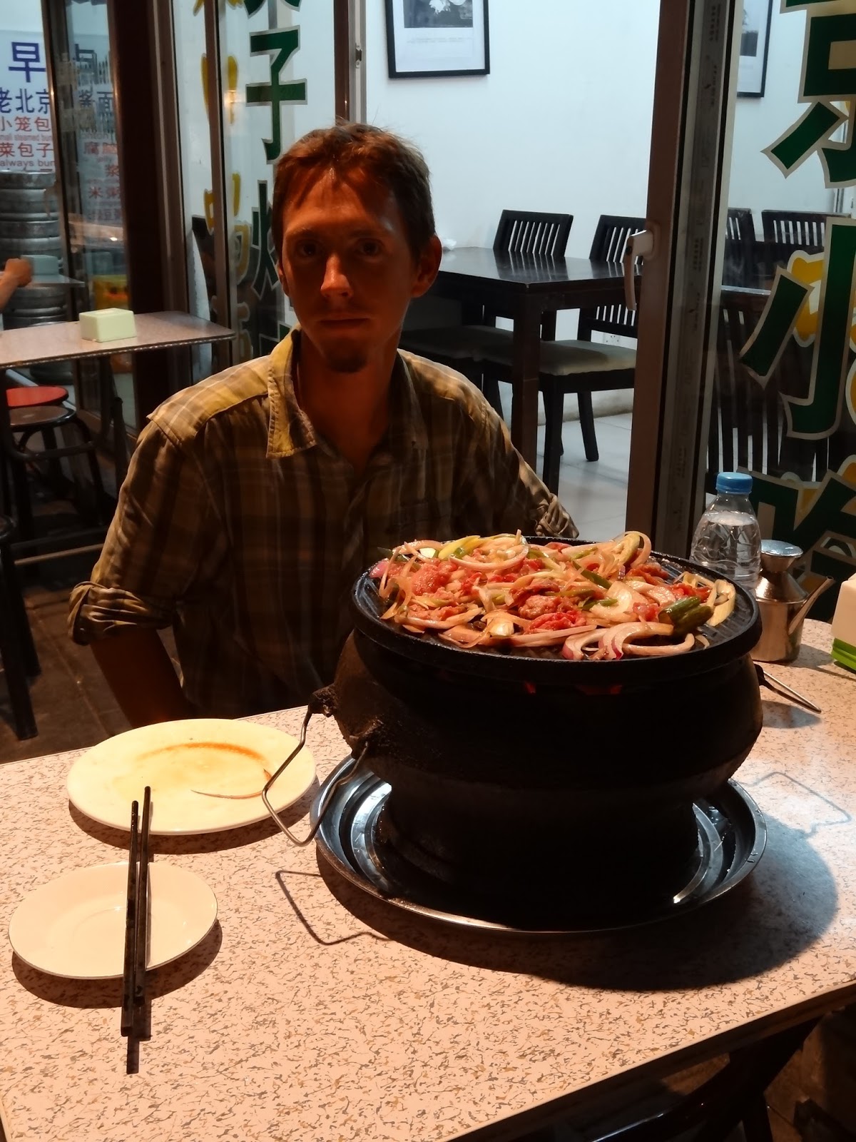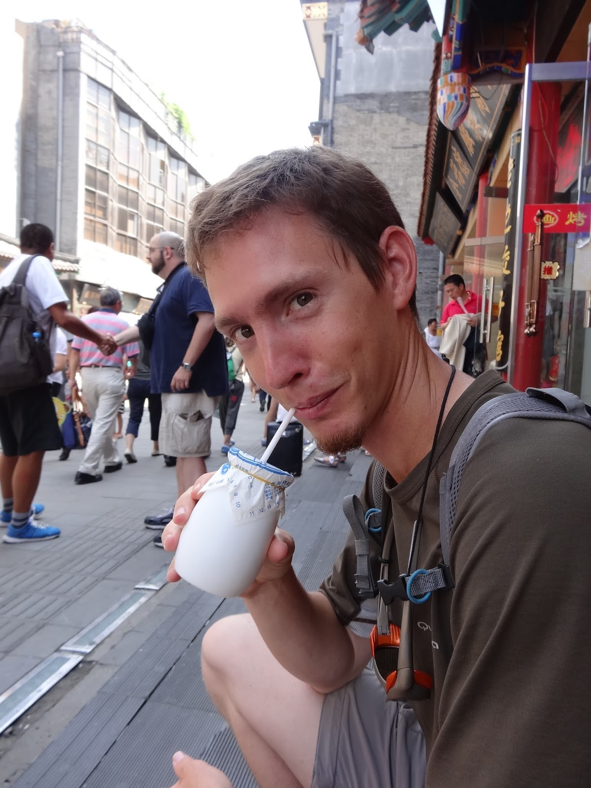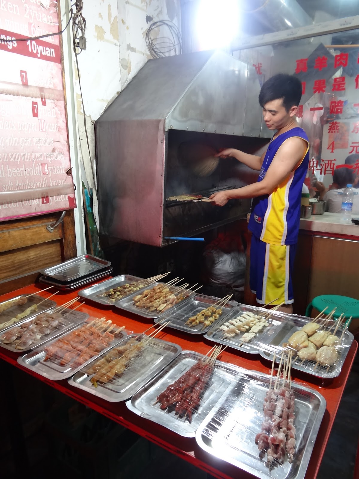 Nous mangeons aussi très bien, la cuisine chinoise propose des choses assez diverses et on est content de retrouver des fruits. Par contre, ça n'a rien à voir avec les resto chinois en France, ici pas de nems ni de beignets de crevettes. Nous essayons presque tout ce que vendent les marchands de rue : brochette de melon, maïs, yaourt (on est content de retrouver des produits laitiers), glaces à l'eau (salvatrice lorsqu'on n'en peut plus de la chaleur), noix de coco, tout ça pour des prix dérisoires.