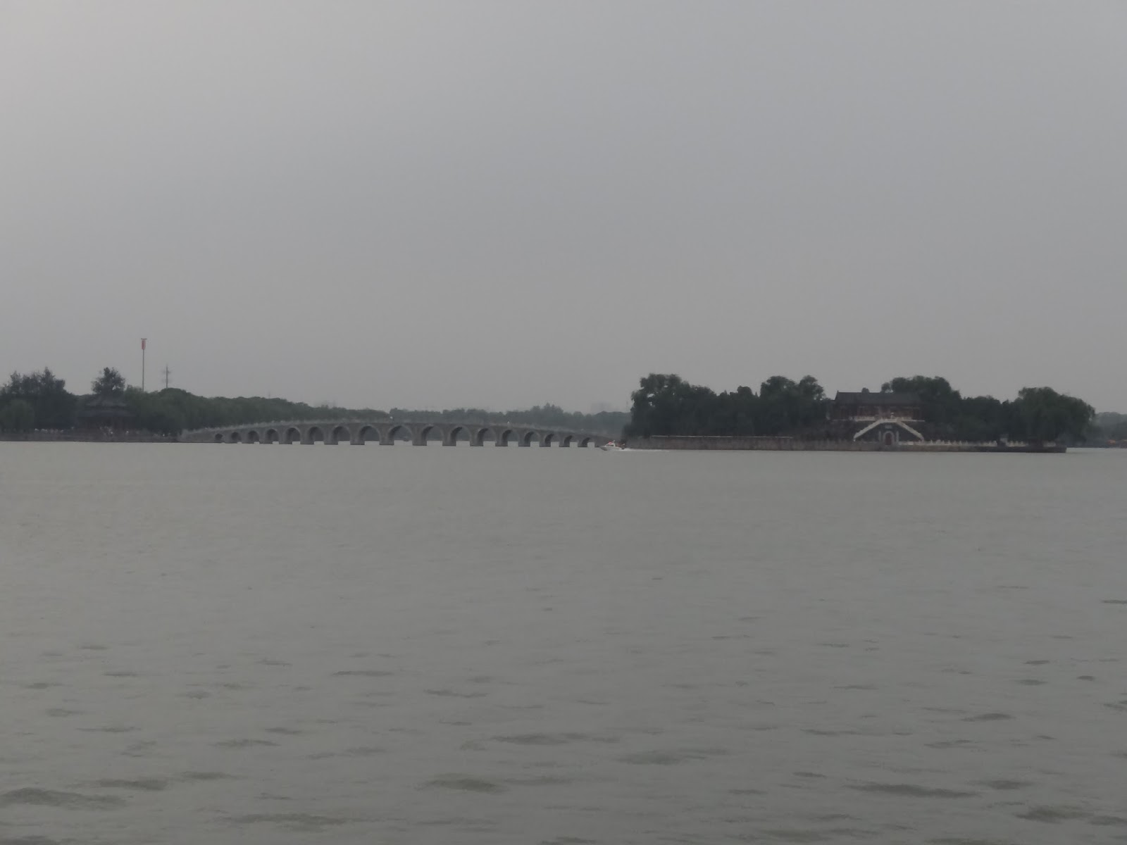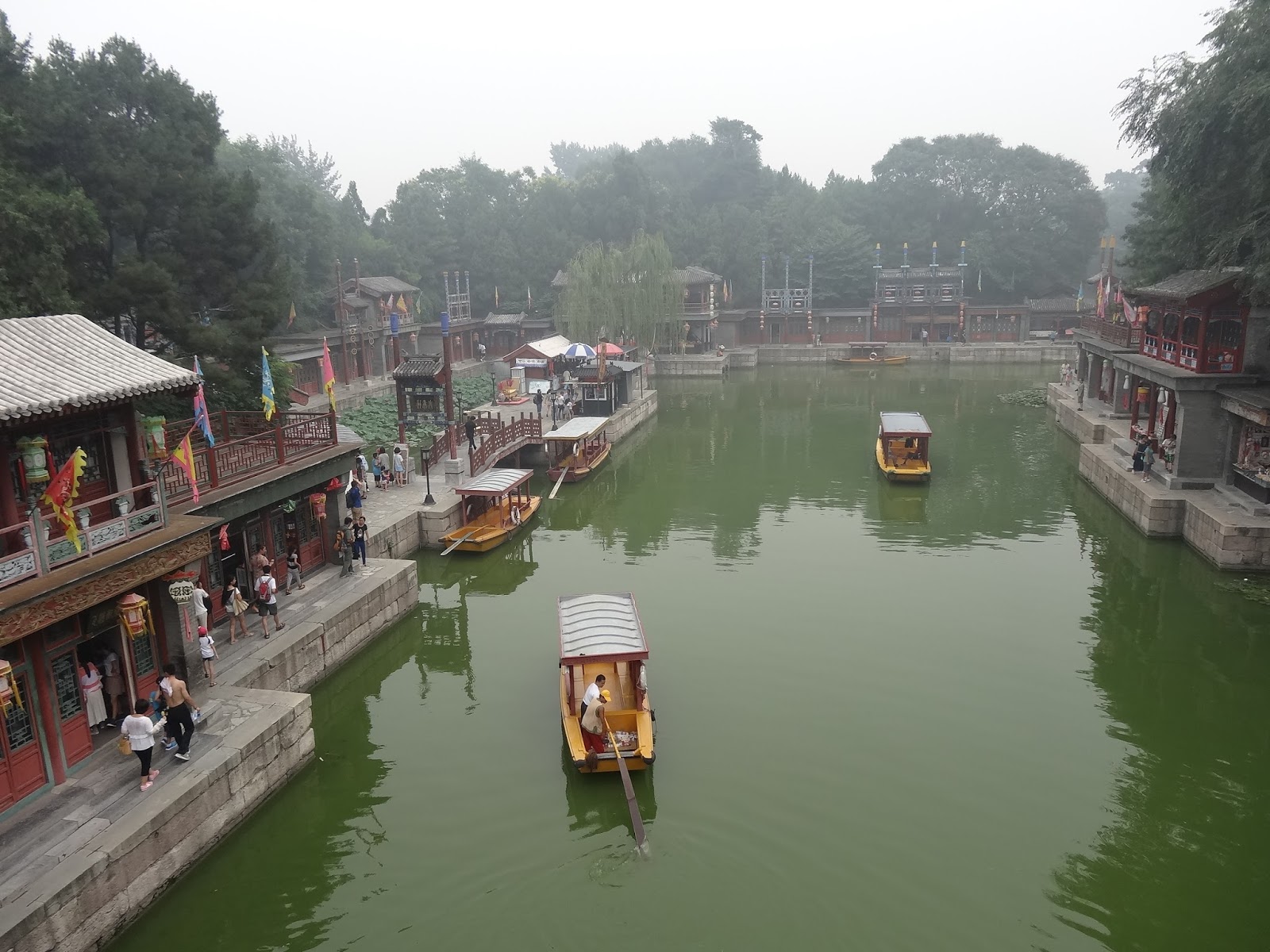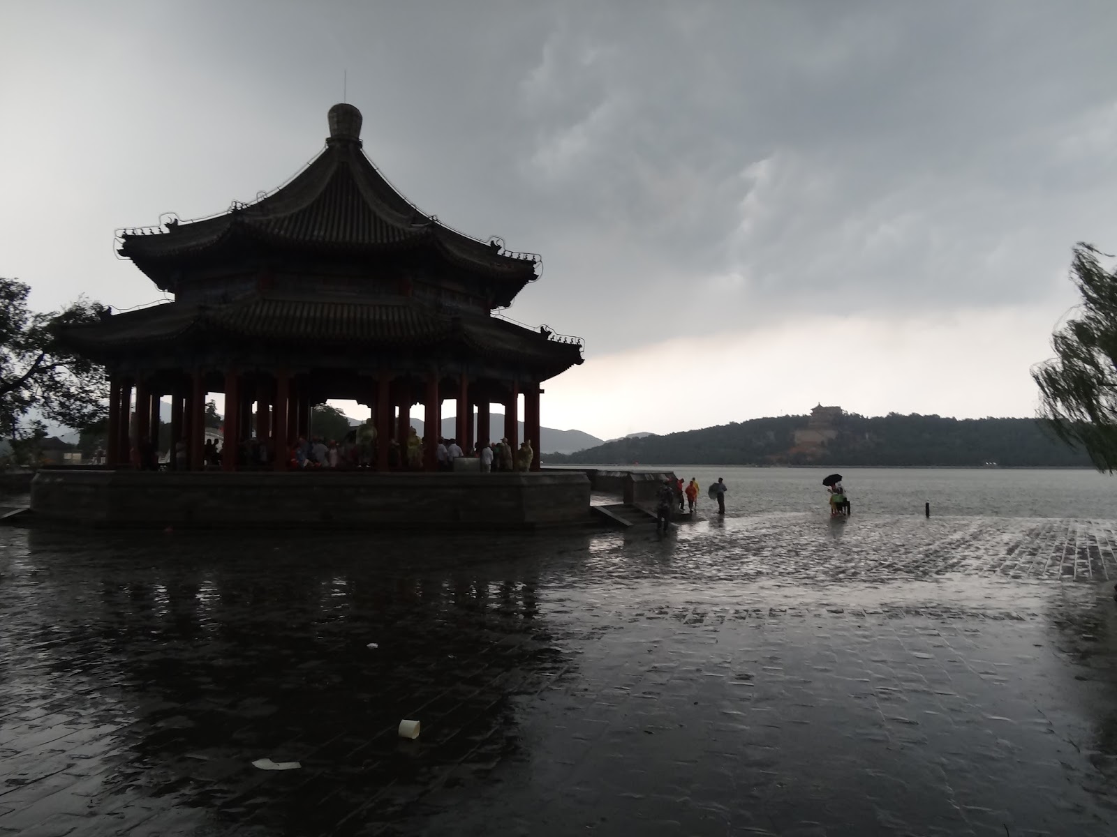 Le Palais d'été, une folie de l'impératrice Cixi mais qui est vraiment grandiose (tout est artificiel, même les reliefs). On a droit à un énorme orage, nous restons plus d'une heure à l'abri dans un local des loueurs de pédalos tellement que l'orage est puissant, la foudre tombe plusieurs fois tout près. Vers la fin, on nous donne un parapluie pour qu'on parte.