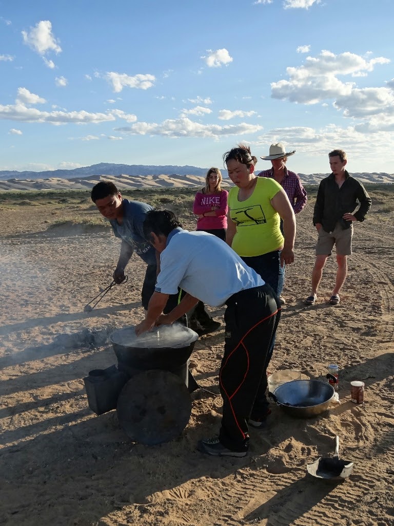 Ensuite le barbecue mongol consiste à faire chauffer des pierres puis à les mettre dans une sorte de marmite avec la viande et quelques légumes au-dessus d'un feu. La marmite est fermée et la cuisson dure une 50aine de minutes.