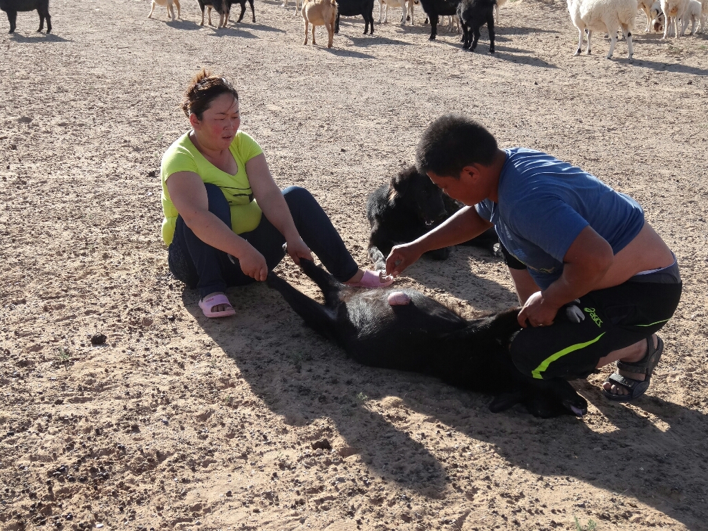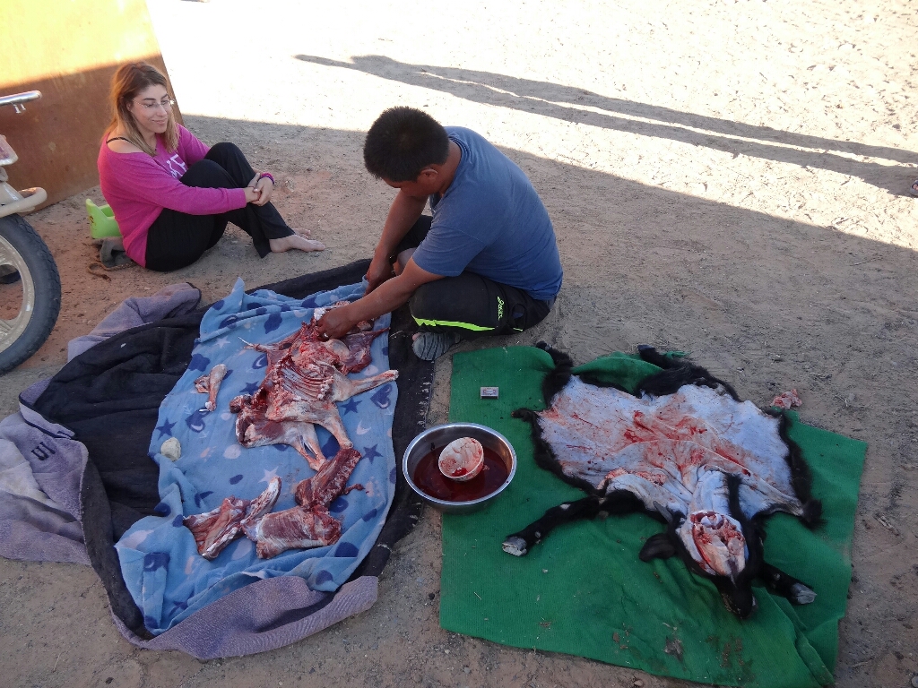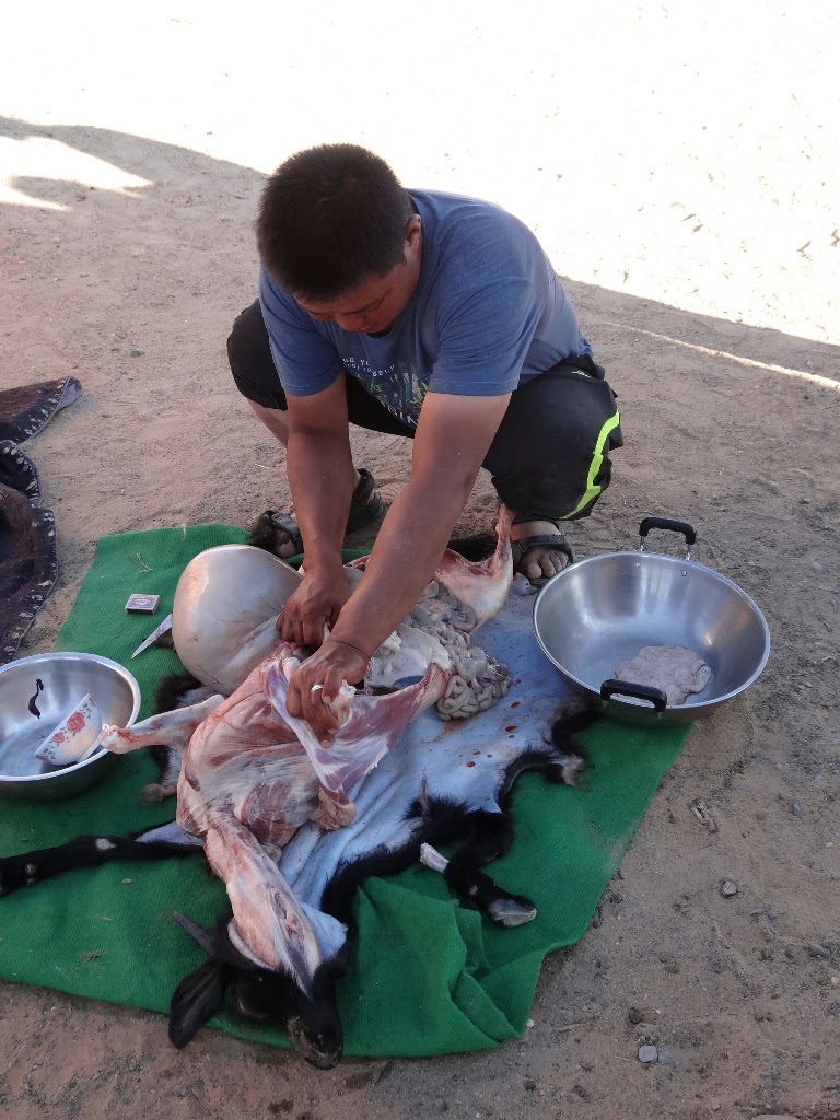 Sur les conseils d'autres voyageurs, nous voulions tester le "barbecue mongol''. Nous avons donc demandé à notre guide si c'était possible et avons acheté une chèvre avec les autres membres du groupe. La famille est d'accord pour préparer ce repas. La technique pour tuer la chèvre est incroyable et réellement magnifique : ils tiennent à deux la chèvre au sol sur le dos, le gars fait une entaille de 7 ou 8 cm dans la peau au niveau de la poitrine puis plonge sa main et son avant bras à l'intérieur de la chèvre vivante pour sectionner avec ses doigts l'artère au niveau du coeur. Ça ne dure que quelques secondes, la chèvre ne bronche pas et tout cela se passe au beau milieu du troupeau. De cette façon tout le sang est récupérer dans la cage thoracique lors de la découpe.