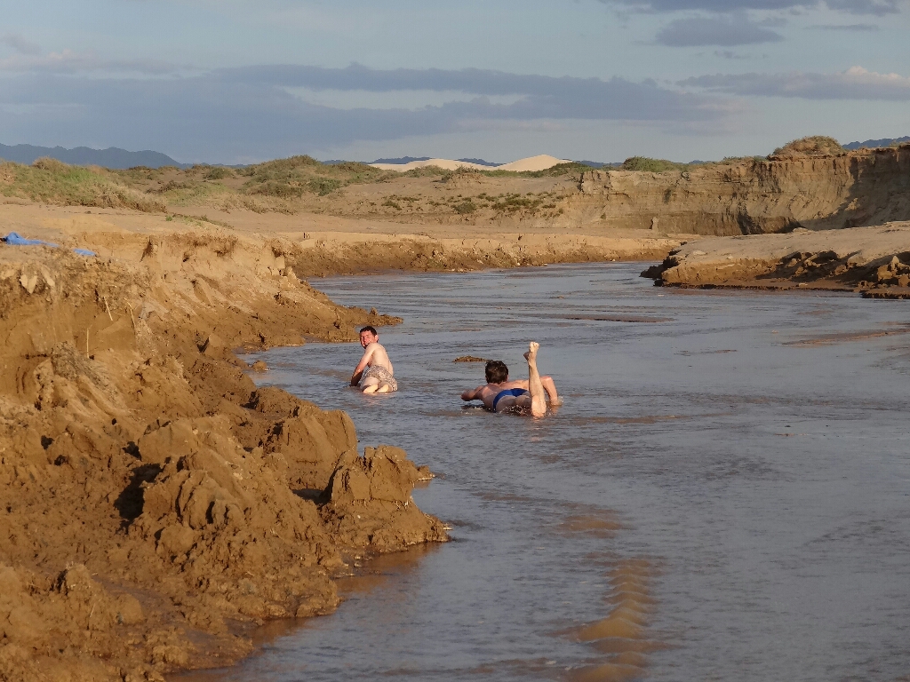 Cela fait 4 jours que nous n'avons pas pris de douche, on s'est tout juste un peu nettoyé avec des lingettes. On pense revenir à la rivière pour s'y baigner et se laver un peu. Les autres membres du groupe sont eux aussi super contents à l'idée de pouvoir se laver un peu. Mais le gars du camp ne voudra pas qu'on s'y lave car les animaux boivent cette eau. Respectant ce milieu, ce sera juste une petite trempette rapide et sans savon dans une eau sableuse et un peu boueuse. Une heure plus tard, on apprendra que les chauffeurs ont nettoyé les camionnettes à la rivière, bonjour la pollution à l'huile moteur, aux graisses et caoutchoucs...