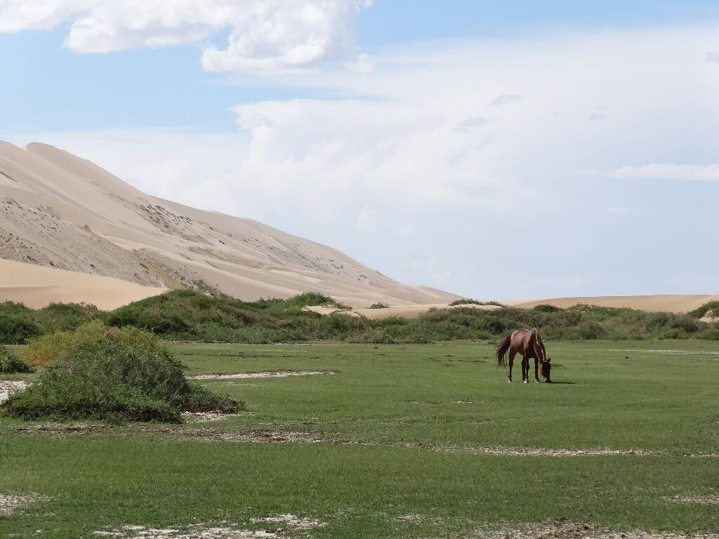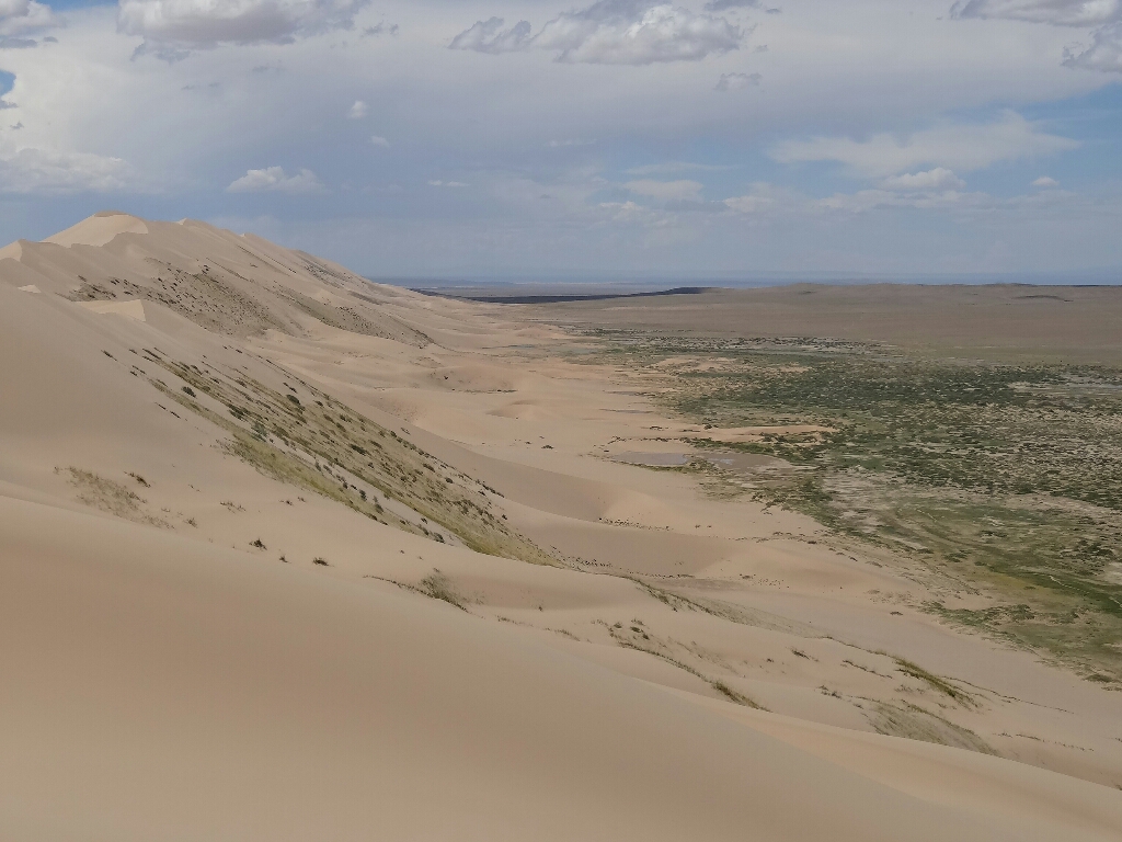 Dans l'après-midi, les chauffeurs nous amènent plus loin où les dunes sont plus hautes encore. Le paysage vu de là est magnifique. La rivière au pied des dunes crée une zone où pousse de l'herbe et où des chevaux et des vaches pâturent, ce décor est vraiment remarquable.