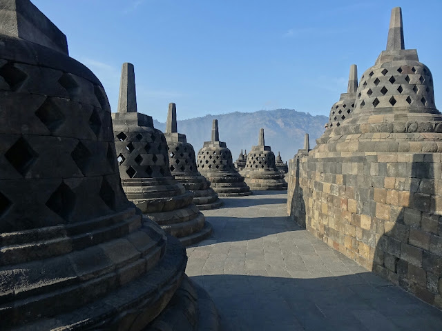 Nous arrivons à Borobudur à l'ouverture, il n'y a pas encore trop de monde et les couleurs du lever de soleil sur le temple sont très belles. Borobudur a été édifié ente 750 et 850, il est le plus gros monument boudique au monde. Au début du XXème siècle, le temple a été remis à jour, il était enterré sous des couches de cendres volcaniques. Il a fait l'objet d'importantes restaurations, il fallu stabiliser le monument qui s'affaissait car la colline sur laquelle il est construit s'était gorgée d'eau au fil des années. Il a également été remis en état suite à l'explosion de bombes posées dans le monument en 1985.