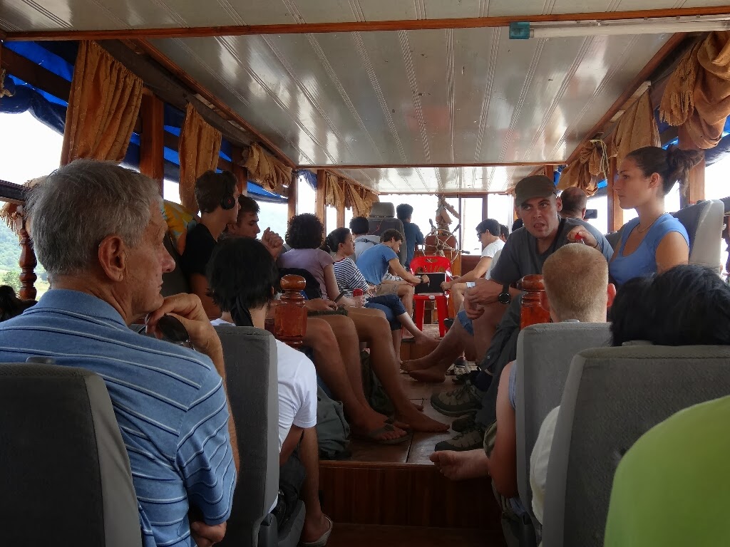 Nous partons enfin. Ce jour là deux bateaux font le trajet, il y a beaucoup de touristes, dont un groupe de jeunes américains qui vont passer leur temps à boire des bières, ah ces jeunes ! Le bateau contient environ 80 personnes et nous sommes assis plutôt confortablement sur des sièges de bus recyclés.