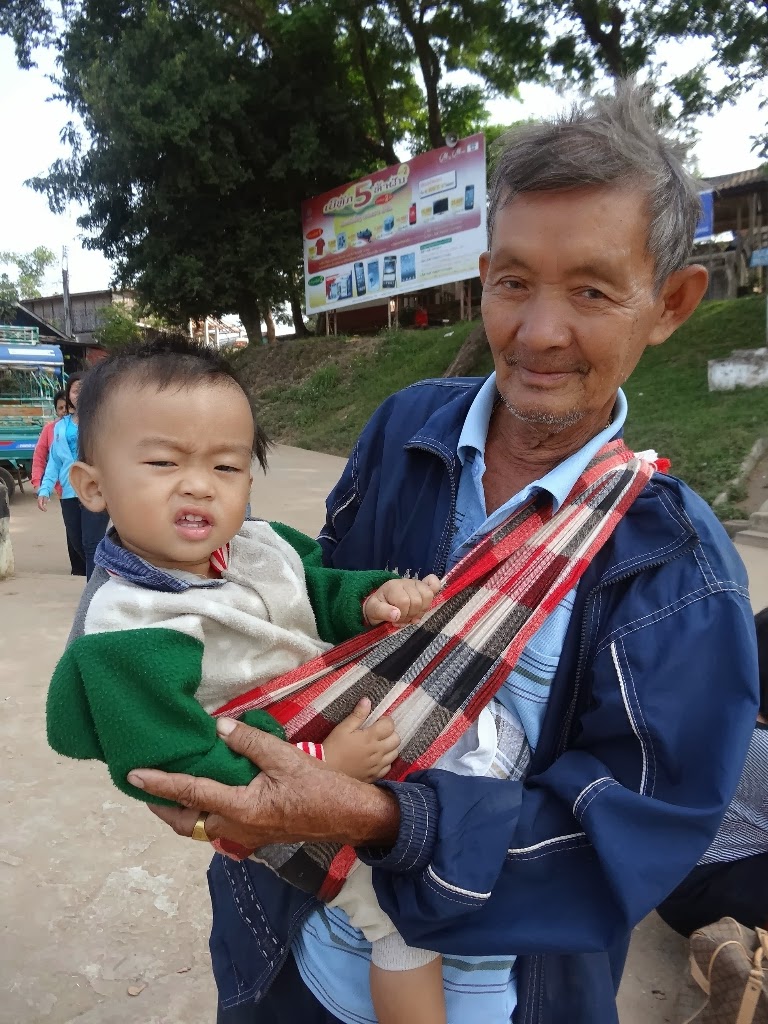 Nous prenons donc le bateau pour Luang Prabang le lendemain de notre retour de Gibbon Experience, le 14 octobre. Nous nous rendons à l'embarcadère 2 heures avant le départ du bateau pour acheter nos tickets. En attendant le départ du bateau, qui partira avec plus d'une heure de retard, nous croisons un grand-père et son petit fils à qui il fait répéter "bonjour" (avec un léger cheveu sur la langue) et nous faisons la connaissance d'un couple de français, Mathieu et Mélissa, qui voyagent plusieurs mois en Asie.