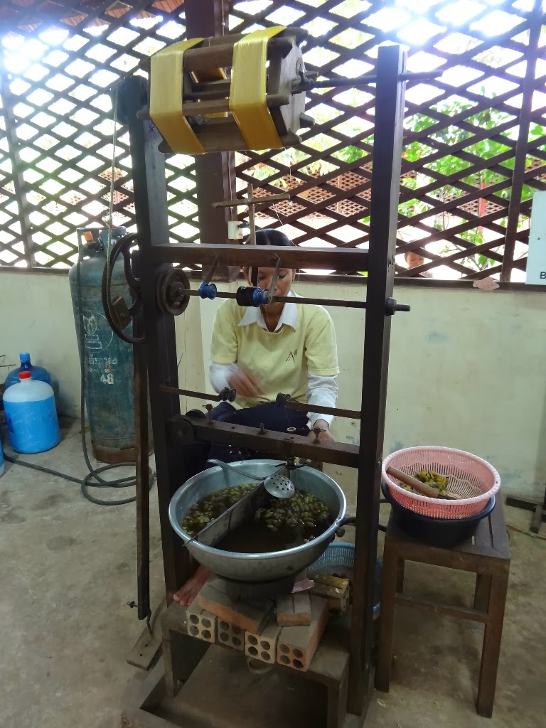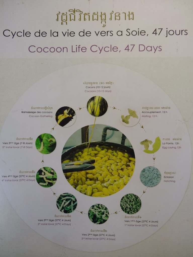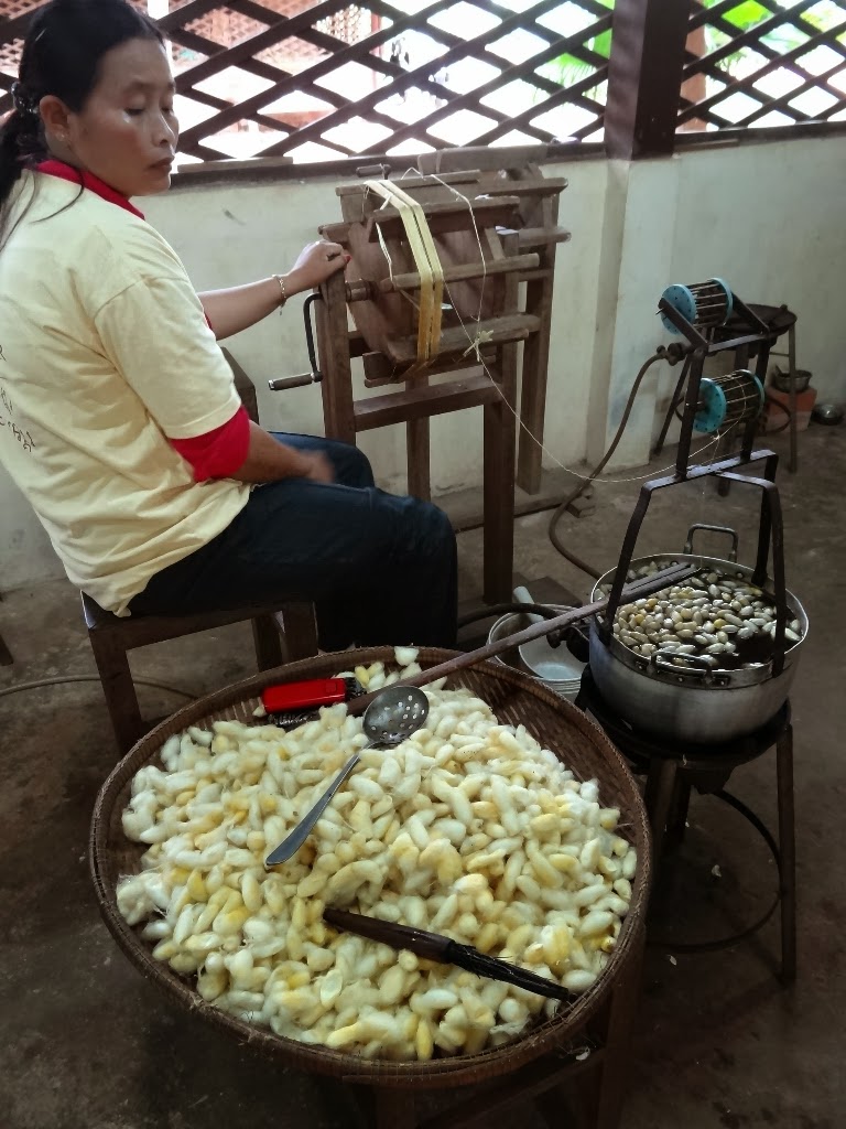 2. Explications très instructives sur le cycle du ver à soie et le tissage. Nous nous étions arrêtés au Laos, lors de notre voyage vers le Nord, dans un village qui élevait les vers à soie... mais c'était beaucoup plus artisanal que ça avec des outils archaïques et tout se pratiquait manuellement jusqu'au tissage, et les tissus sortant de ces métiers à tisser installés sous les maisons sur pilotis étaient aussi très beaux. A Siem Reap, nous avons aussi visité une institution qui emploie les jeunes pour la fabrication d'objets destinés aux touristes... mais le groupe a passé ensuite du temps dans le magasin de vente!!!