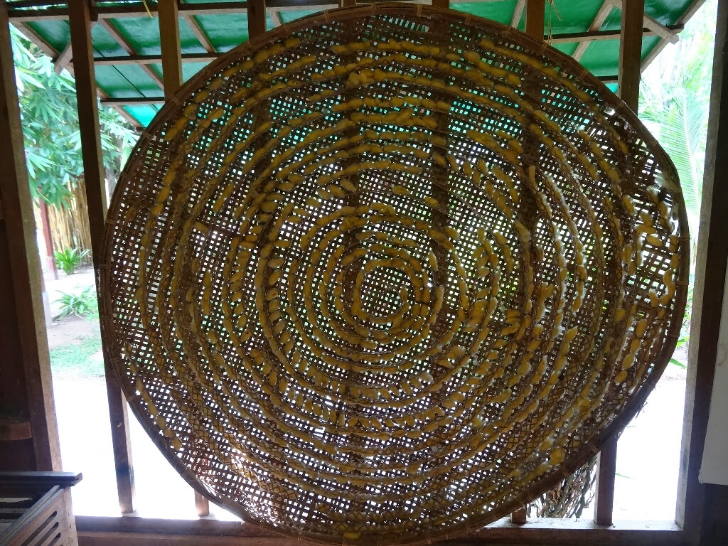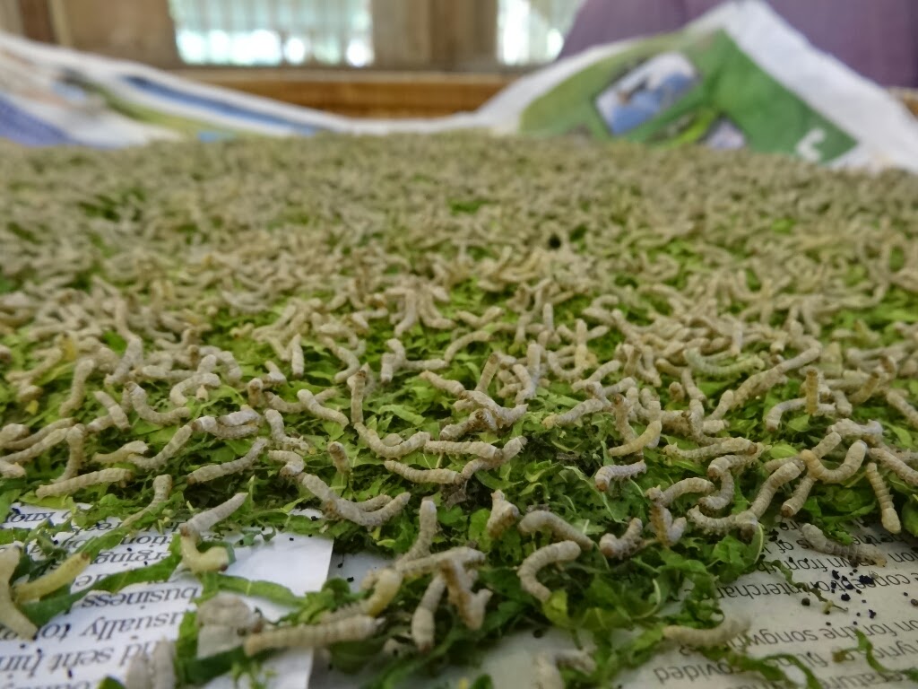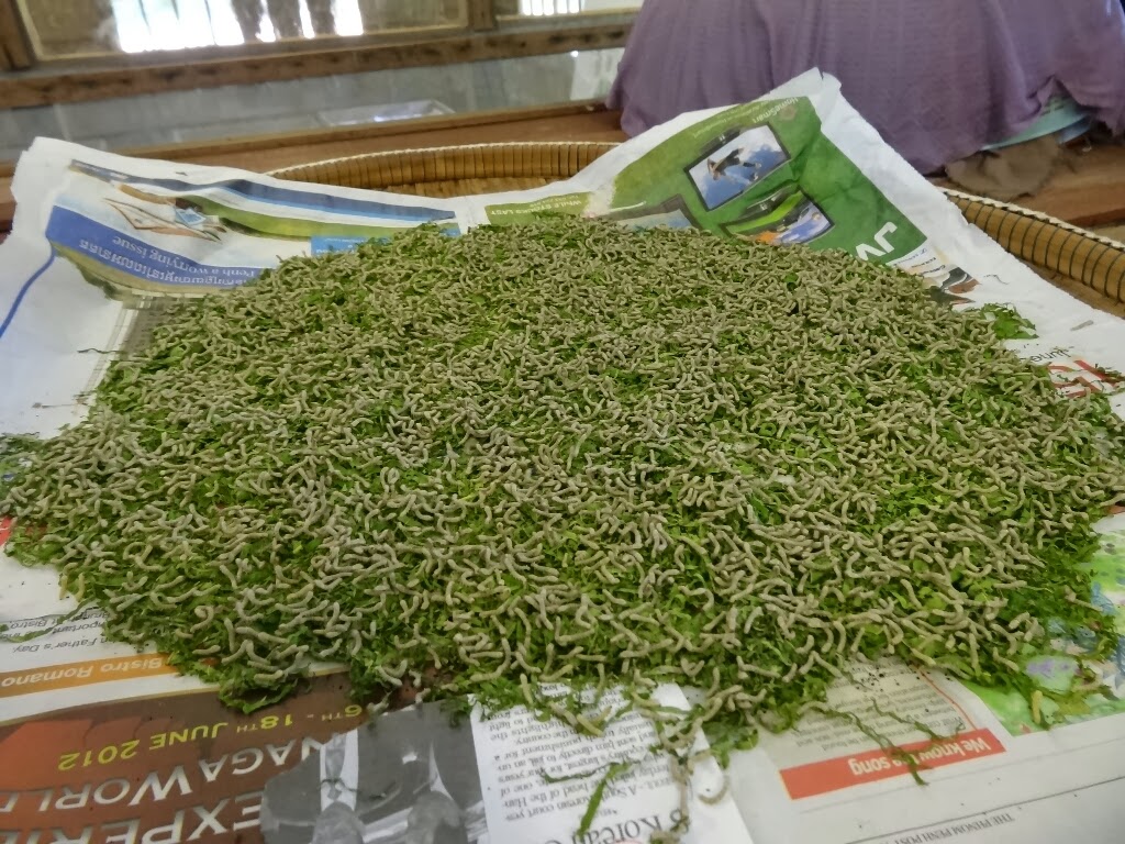 D'abord les vers sont nourris de feuilles de mûrier (ils ne mangent que ça). Les mûriers sont cultivés sur place en plein champ.