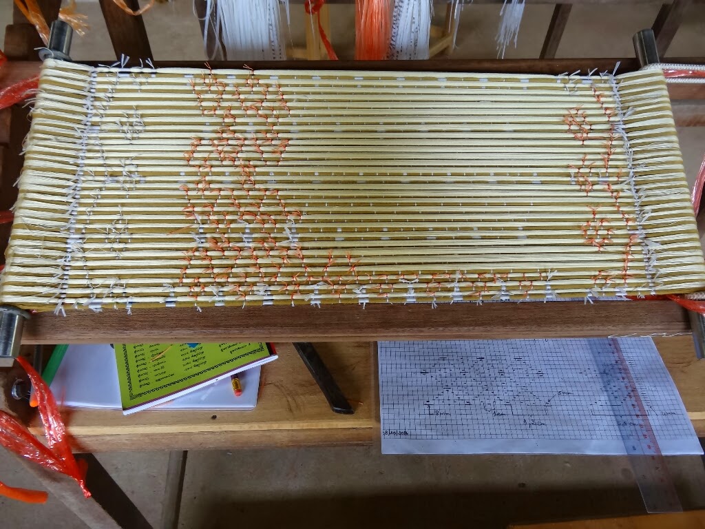 La coloration peut se faire à partir de produits naturels (fibre de noix de coco, feuilles de bananiers, résine,etc.) ou de produits chimiques (les couleurs seront plus permanentes). Le fils est soit coloré uniformément soit coloré de différentes couleurs pour réaliser des tissus à motifs. C'est un travail très minutieux : le fils est mis sur un support, le motif est reproduit et des bouts de scotch sont positionnés sur les zones qui ne doivent pas être colorées. Après le premier bain de couleur les scotchs sont déplacés et un deuxième bain d'une couleur différente est réalisé. Et ainsi de suite jusqu'à que l'ensemble des colorations soient faites. Ces fils sont ensuite mis sur de petites bobines.