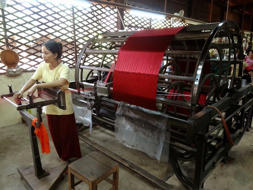 La visite se termine par le grand atelier rempli de métiers à tisser où des femmes (et un homme) tissent la soie (nous sommes dimanche, l'atelier est un peu vide). L'explication du fonctionnement d'un métiers à tisser est bien trop compliqué mais leur travail est vraiment impressionnant.