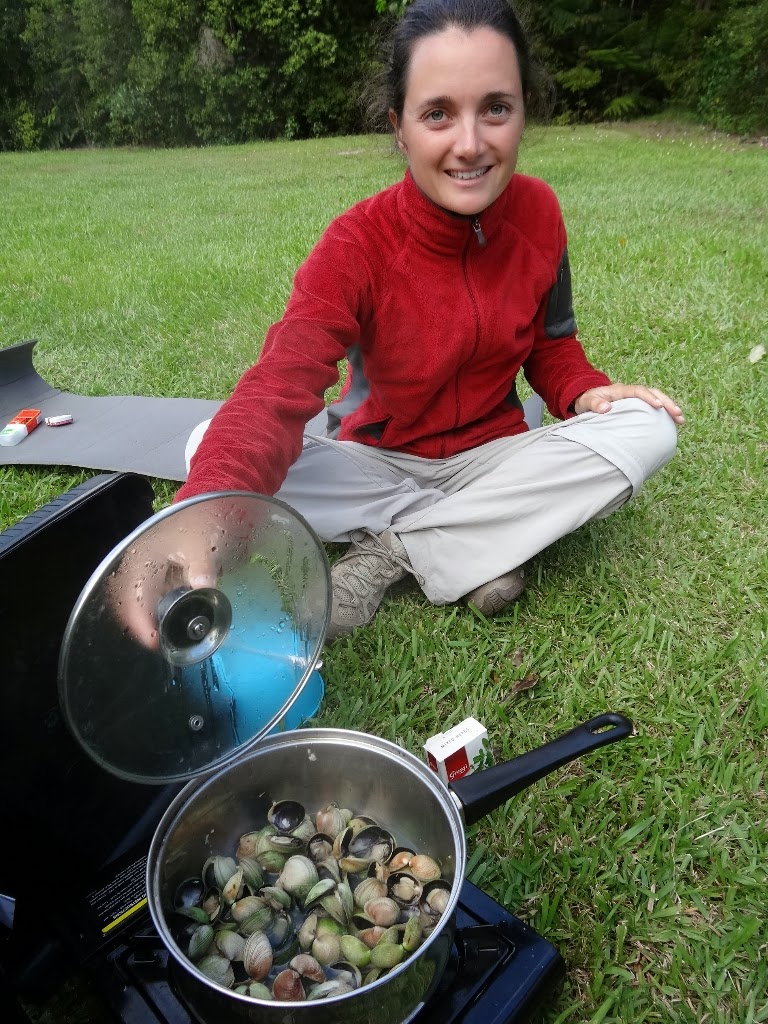 Et voilà les coquillages, avec un peu d'ail et des herbes, avant qu'ils ne disparaissent dans notre estomac. Pas mal pour une entrée de repas en camping.