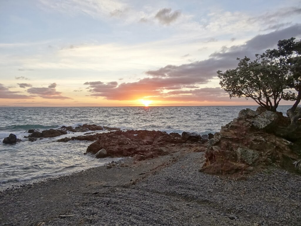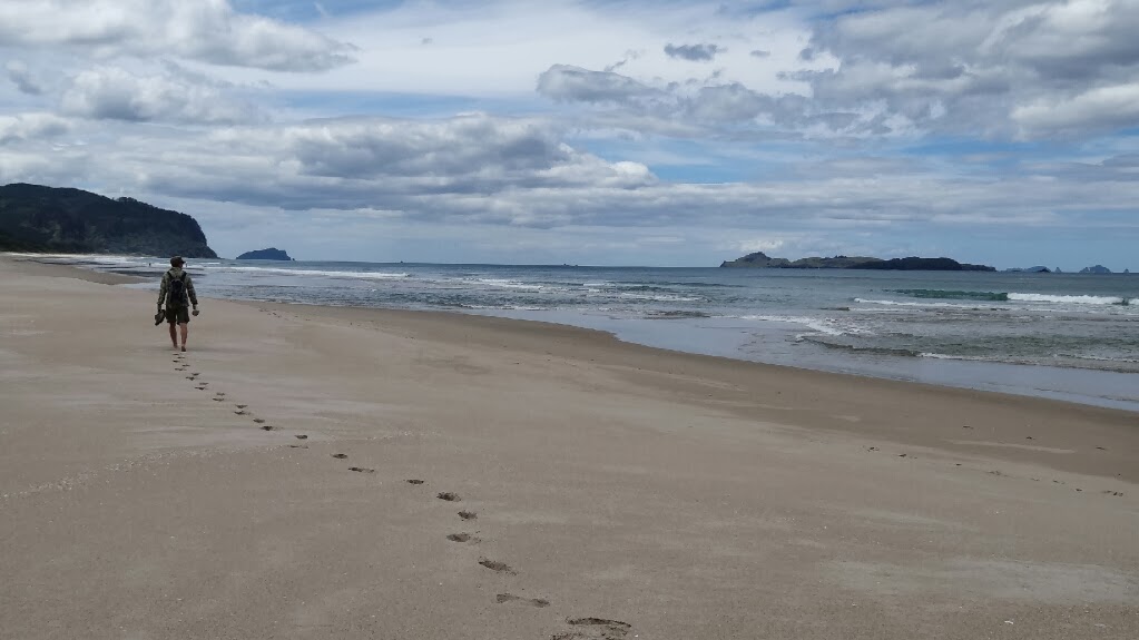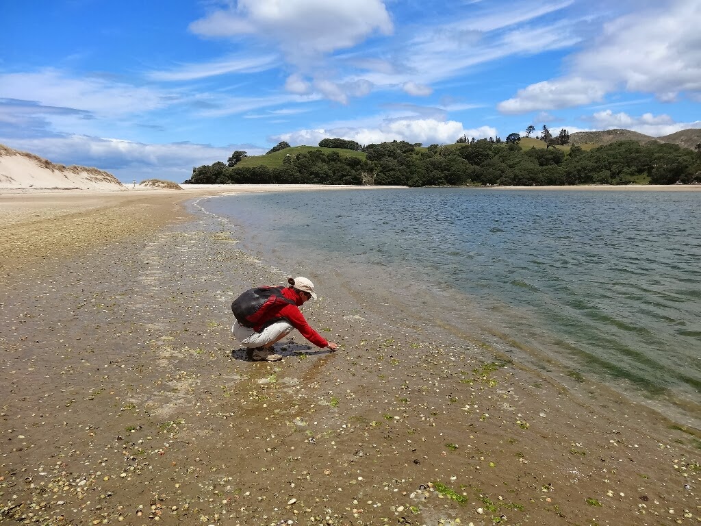 Après cette balade historique, nous reprenons la route qui suit la côte Est de la péninsule jusqu'à la plage d'Oputere qui est une très belle plage mais aussi une réserve pour une espèce de doterelle qui est en voie de disparition. Nous ne voyons pas la doterelle mais nous ramassons des coquillages, semblables à des coques, pour le repas du soir.