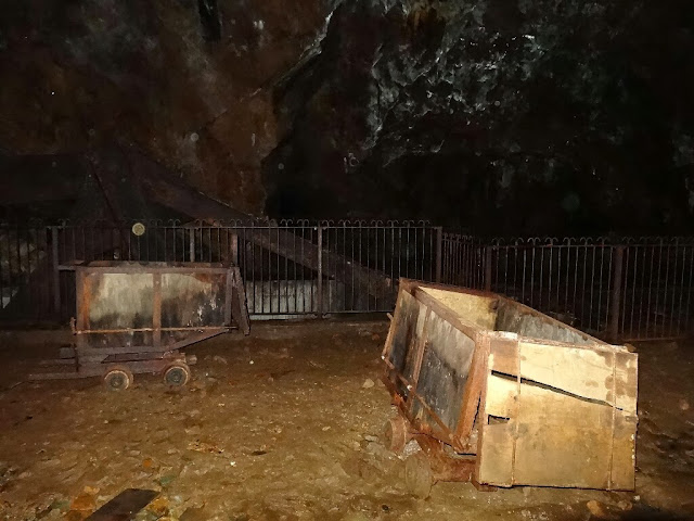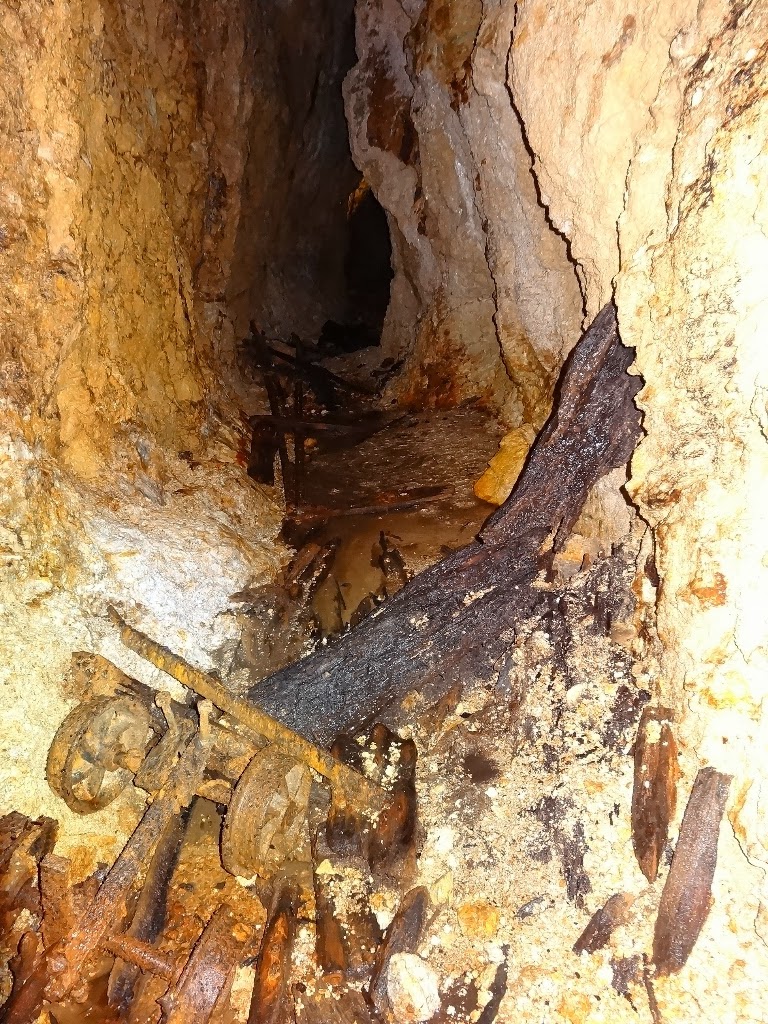 Le chemin de randonnée suit les anciens rails de la mine et nous pouvons aller explorer certaines galeries. Nous y retrouvons des glow worms (vers lumineux) et quelques vestiges de l'exploitation. Boris scrute toutes les parois en quête de la grosse pépite qui nous rendra riches. Finalement, il joue le mineur à grands coups de cailloux sur le filon et décroche un bout de quartz contenant ce qui semble être une paillette. Super content d'avoir trouvé de l'or, il pourrait rester là à casser du cailloux pendant des jours mais Édith s'impatiente.