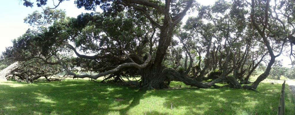 Nous continuons notre route vers le Nord en suivant la côte sur une piste bordée de Puhutukawa, ou "christmas tree" car ils fleurissent à Noël. Ces vieux arbres ont des formes extraordinaires, ils se tordent à cause du vent, se cassent et repartent de plus belle.