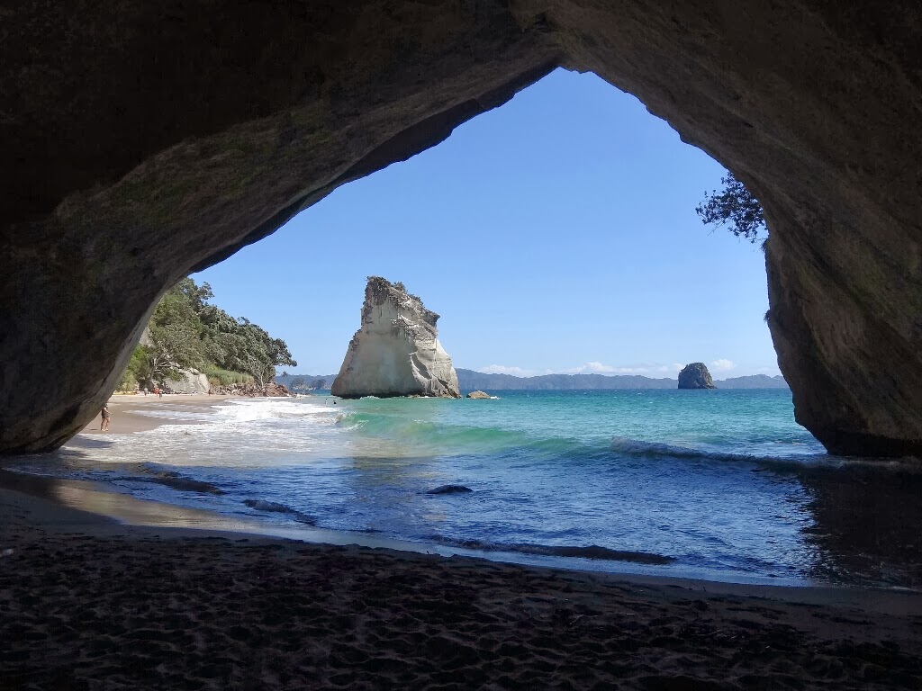 Le lendemain à 9h nous embarquons sur notre kayak pour une sortie de 3h30 accompagnés d'un guide et d'une autre touriste. Nous faisons d'abord le tour d'une petite île en face de la plage. La mer est plutôt houleuse, ça bouge pas mal. Nous passons dans une grotte avec le kayak puis on se dirige, à contre vent, vers la plage de "Cathedral Cove", il faut tirer fort sur les pagaies.