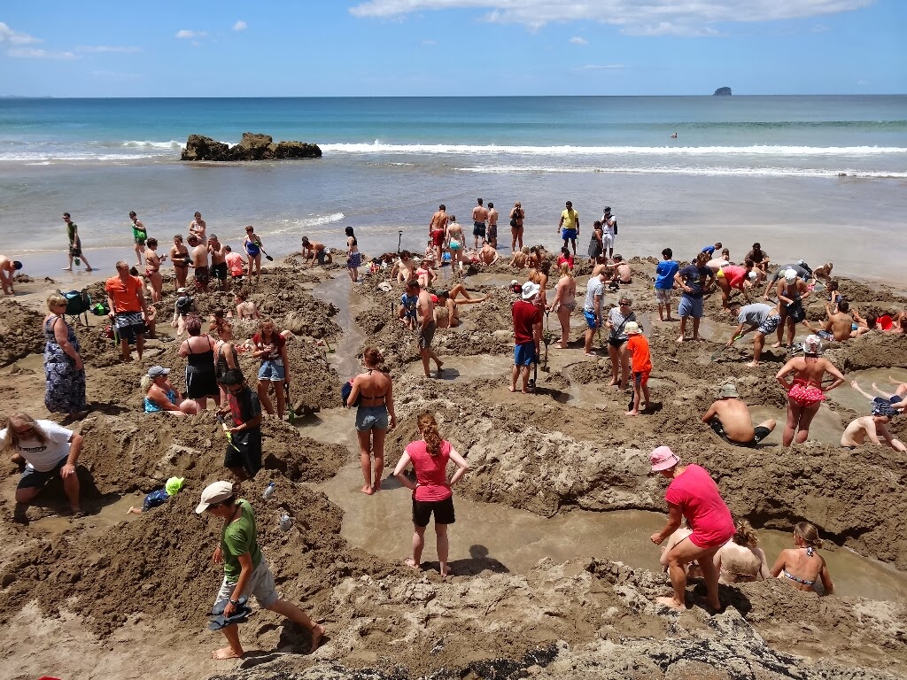 Dans l'après-midi, nous arrivons à Hahei en faisant un petit détour par "Hot water beach". Ici des sources d'eau chaude (très chaudes) émergent directement du sable à marée basse. Deux fois par jour durant quelques heures, les gens viennent et creusent de petits bassins pour se prélasser dans ces eaux chaudes. Le coin est malheureusement très connu et beaucoup de monde est déjà sur place. Cet attroupement nous fait penser à une colonie d'otaries mais ce sont ici des mammifères d'un autre genre.