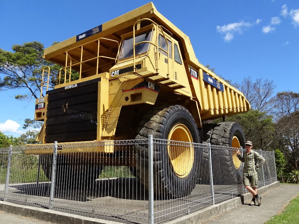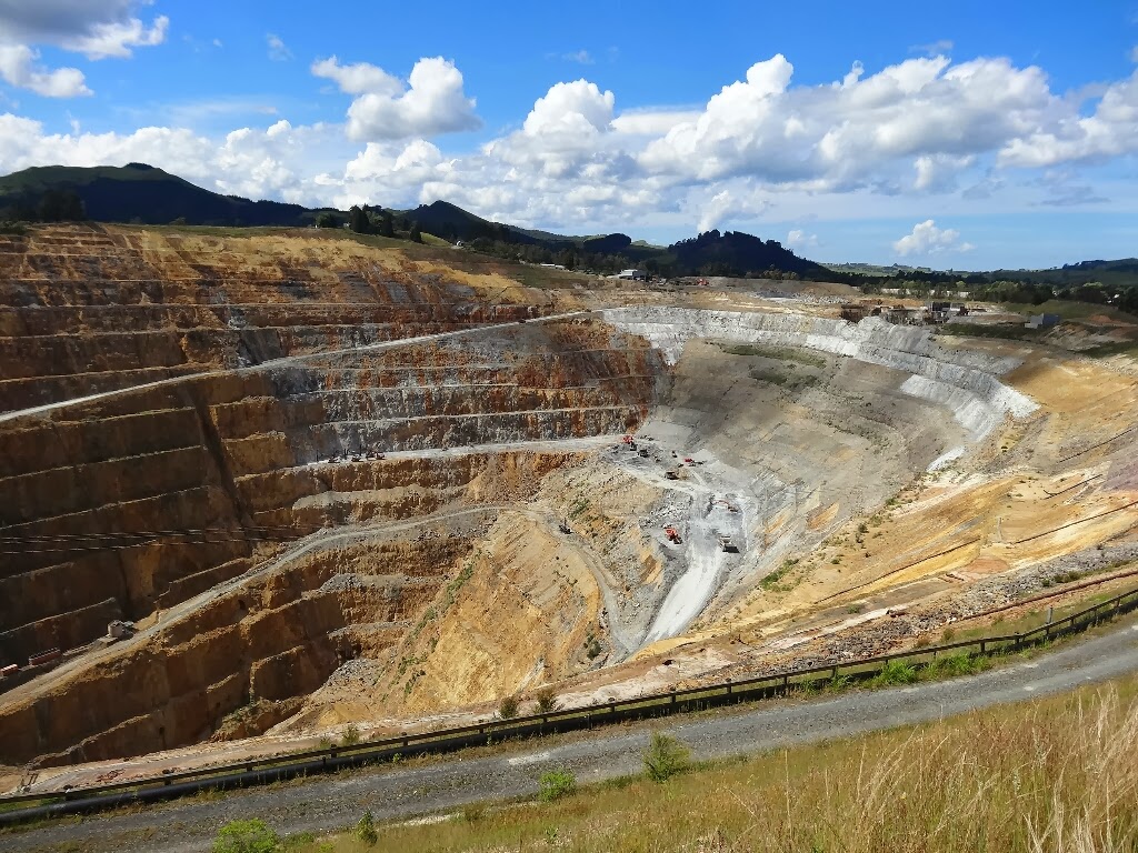 Puis nous allons jusqu'à la ville de Waihi, où se trouve une mine d'or à ciel ouvert, la mine Marta. On sent bien que de gros efforts de communication sont fait autour de ce site, une balade en fait le tour et de nombreux panneaux explicatifs la jalonne. Les filons de quartz orifères étaient, à partir de la fin du XIXe siècle, exploités par une mine sous forme de galeries, il y en avait environ 175km sur une profondeur allant jusqu'à 600m. De nos jours c'est un énorme trou sur une colline et à la fin de son exploitation ce trou deviendra un lac de plaisance.