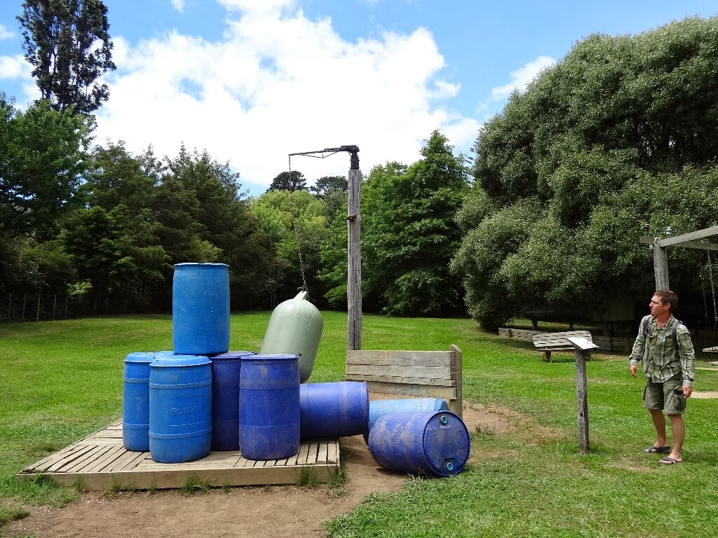 Puis on s'arrête pour visiter une sorte de parc d'attraction artistique, éducatif et humoristique rassemblant diverses activités et sculptures autour de l'eau et fabriquées à partir de matériel de récupération. On retombe en enfance : courses de petits bateaux, batailles d'eau, mécanisme à activer et qui parfois nous arrose, vélo volant, cage à hamster, chamboule tout géant,... On s'éclate comme des gosses.