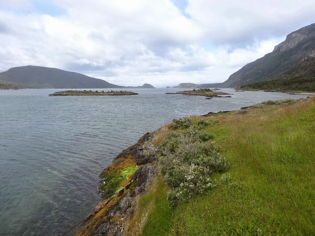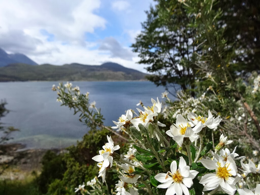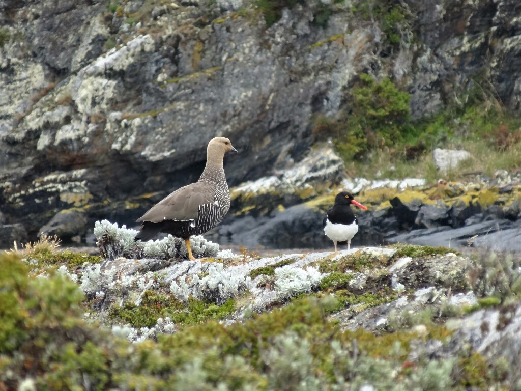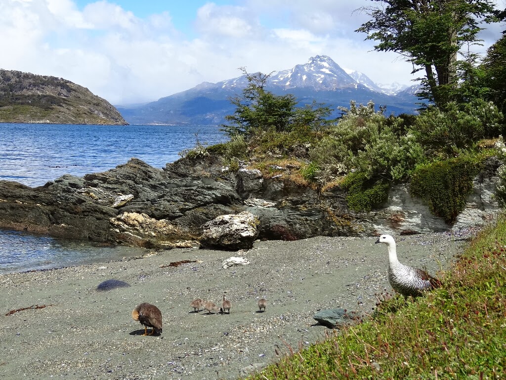 Pour le premier jour de l'année 2014, on se rend en bus dans le parc naturel de Terre de Feu, à quelques kilomètres d'Ushuaia. Nous faisons une première randonnée qui suit la côte le long de la baie Lapataia jusqu'au camping du "lago Roca". Le temps varie entre grosses averses, vent et soleil. Les éléments sont maîtres ici, on a bien fait de s'équiper de sur-pantalons étanches à Ushuaia. Les paysages sont très beaux, les plantes sont en fleurs et nous observons beaucoup d'oiseaux et encore une famille d'oies pas très farouches.