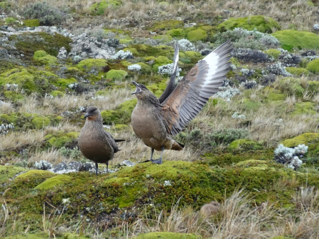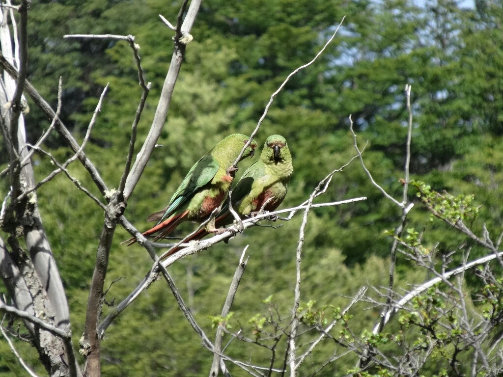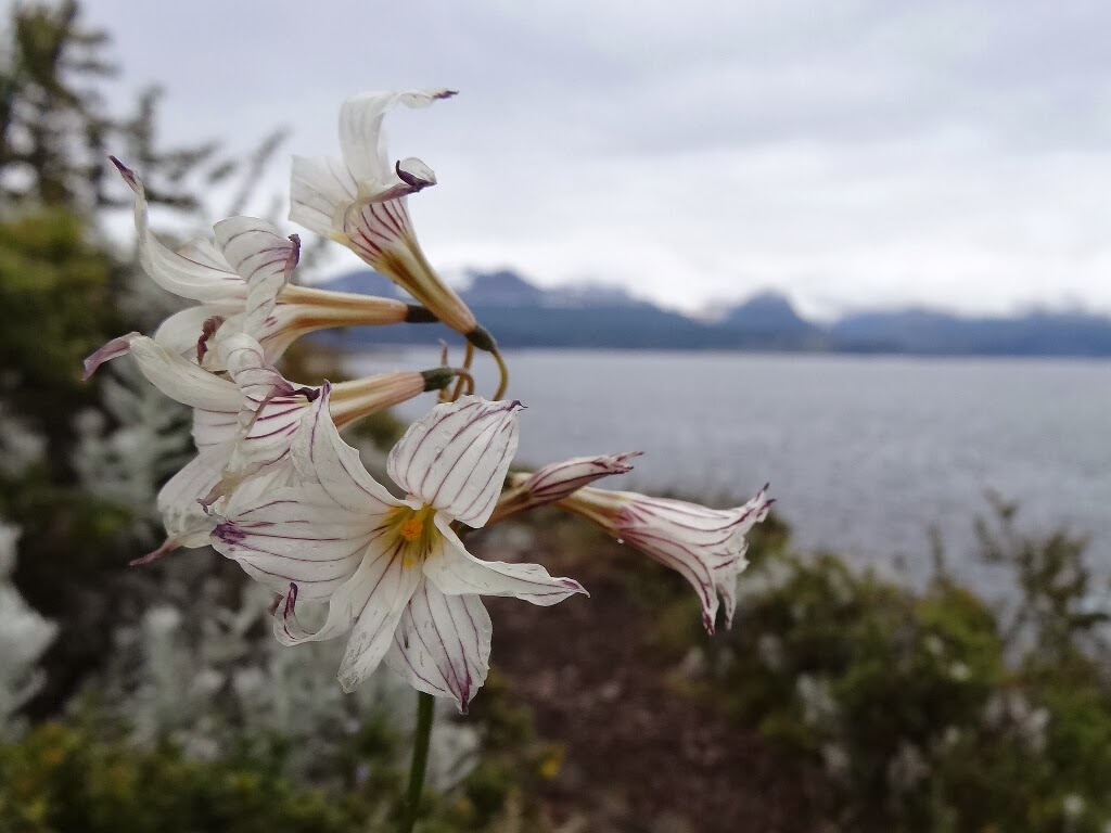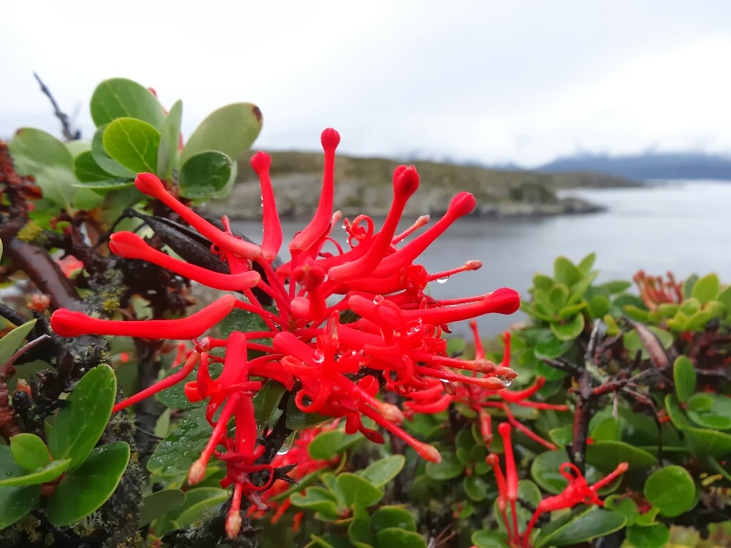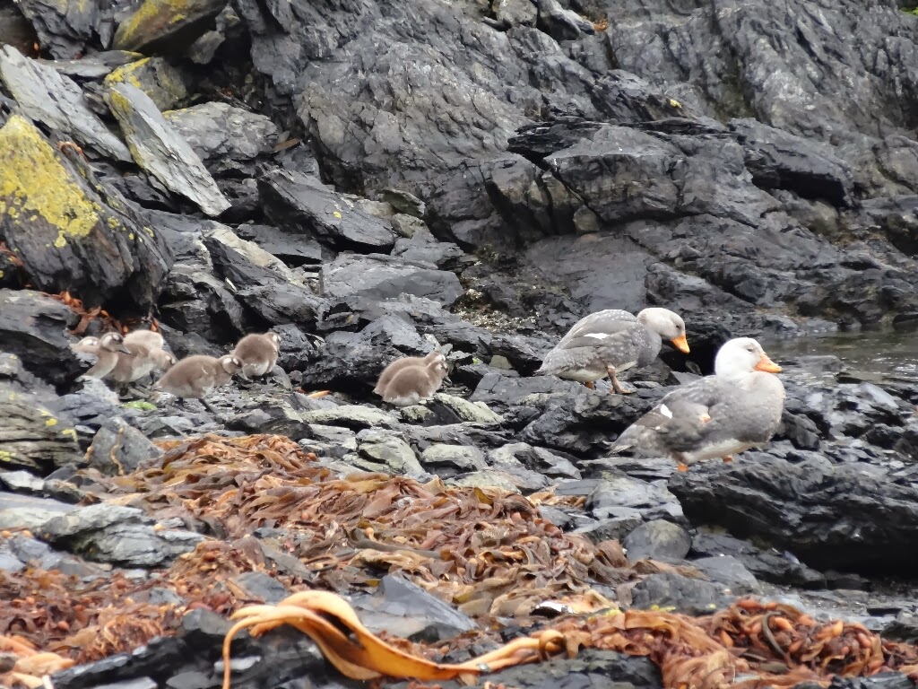 Pour le premier jour de l'année 2014, on se rend en bus dans le parc naturel de Terre de Feu, à quelques kilomètres d'Ushuaia. Nous faisons une première randonnée qui suit la côte le long de la baie Lapataia jusqu'au camping du "lago Roca". Le temps varie entre grosses averses, vent et soleil. Les éléments sont maîtres ici, on a bien fait de s'équiper de sur-pantalons étanches à Ushuaia. Les paysages sont très beaux, les plantes sont en fleurs et nous observons beaucoup d'oiseaux et encore une famille d'oies pas très farouches.