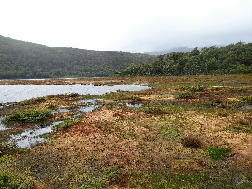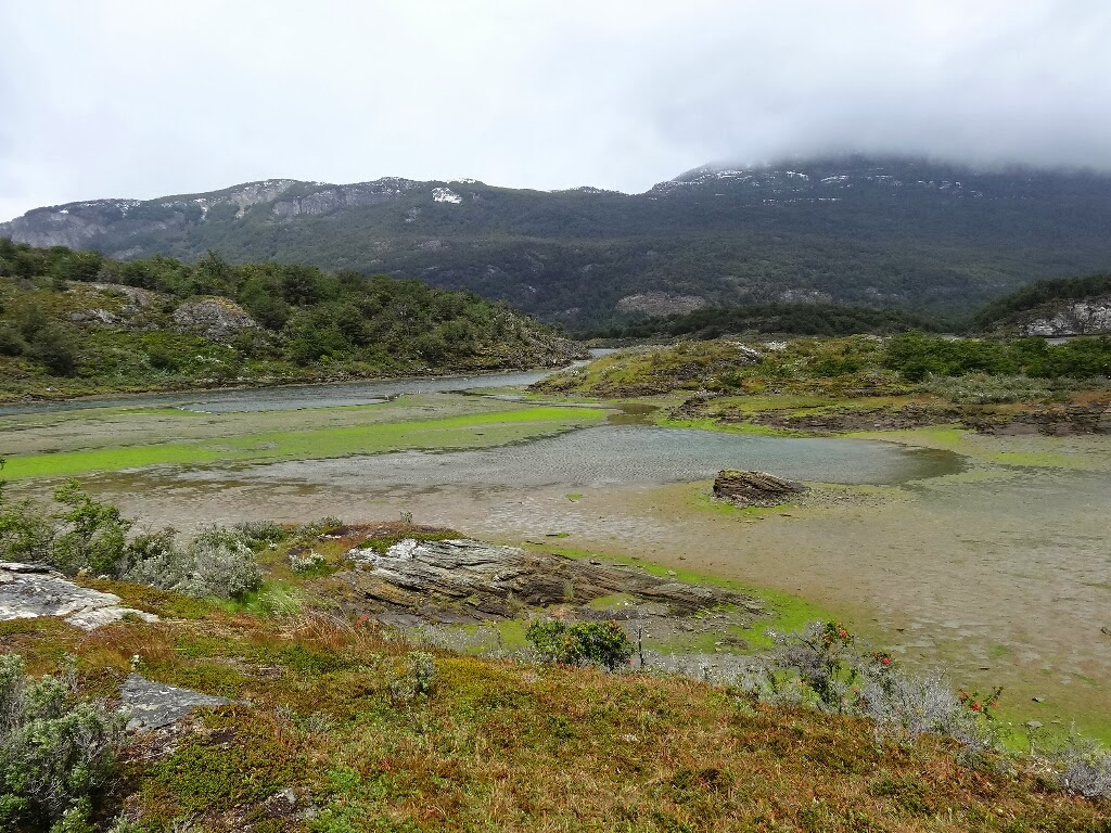 Le lendemain, il pleut, pour changer... Nous pensions faire une randonnée qui mène à un point de vue mais le plafond nuageux est très bas alors nous décidons de nous promener dans la lagune Lapataia, entre lac, tourbières, mer et montagne, c'est très beau même si le soleil se cache.