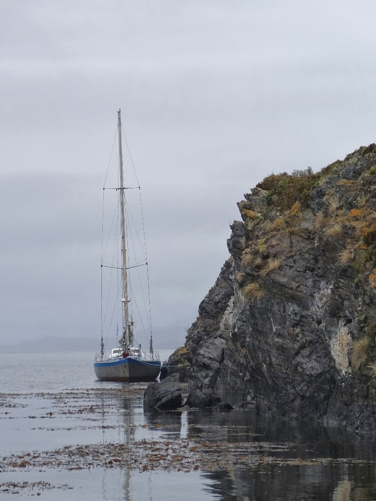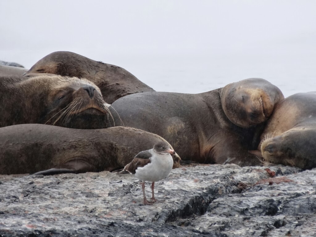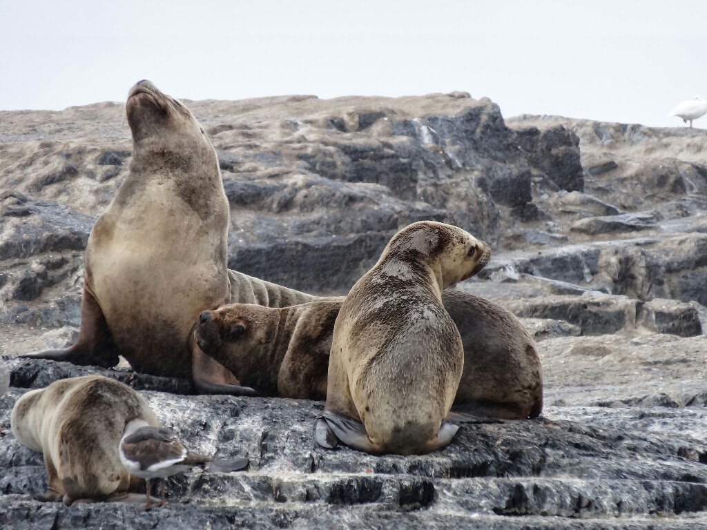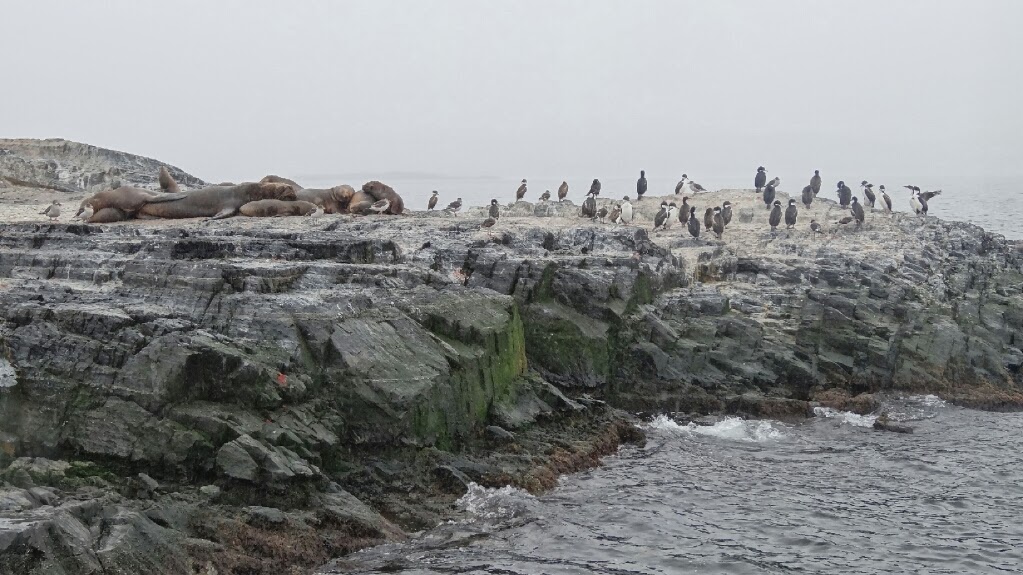 Le temps est pluvieux, nous n'avons pas de chance avec les bateaux (souvenir du fiord de Nouvelle-Zélande). Il n'y a pas de vent, du coup la sortie ne se fait pas à la voile. Nous observons des cormorans et des lions de mer sur un rocher, cette espèce est bien plus grosse que ceux de Nouvelle-Zélande.