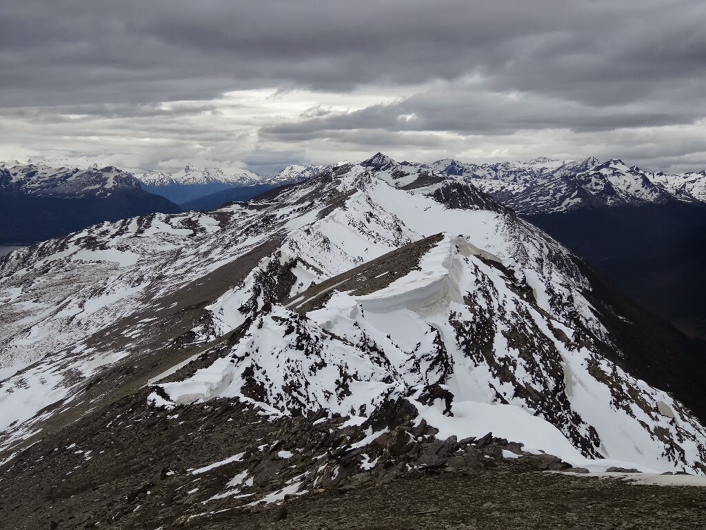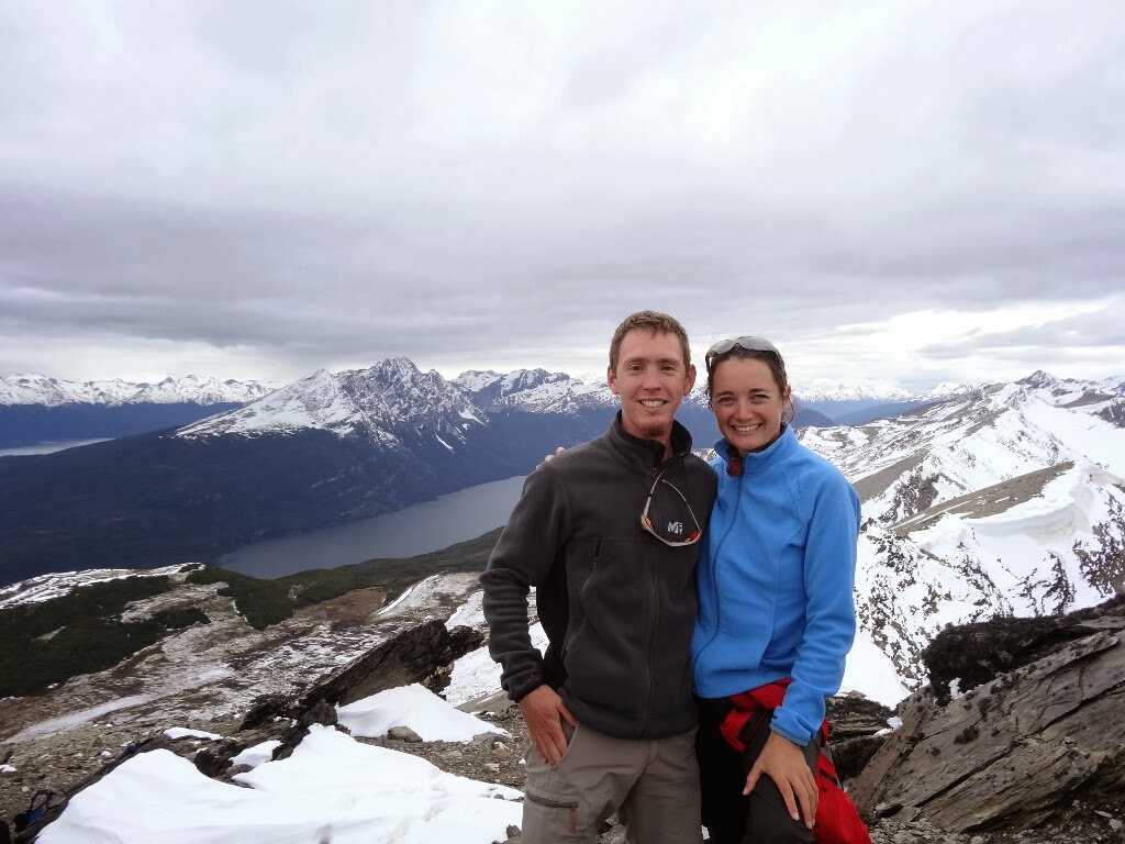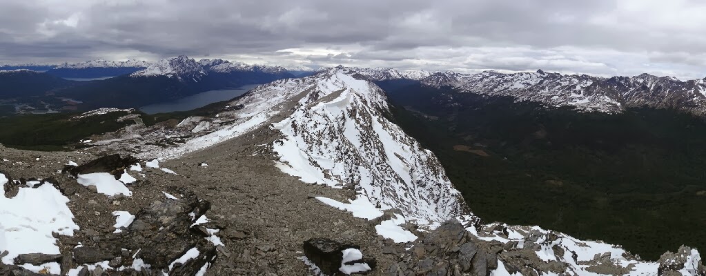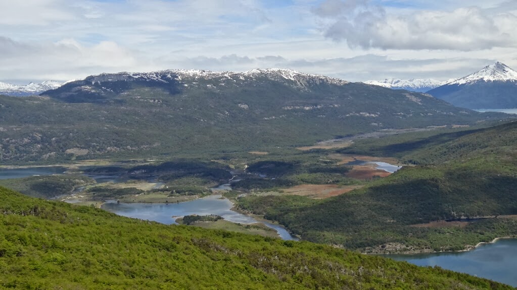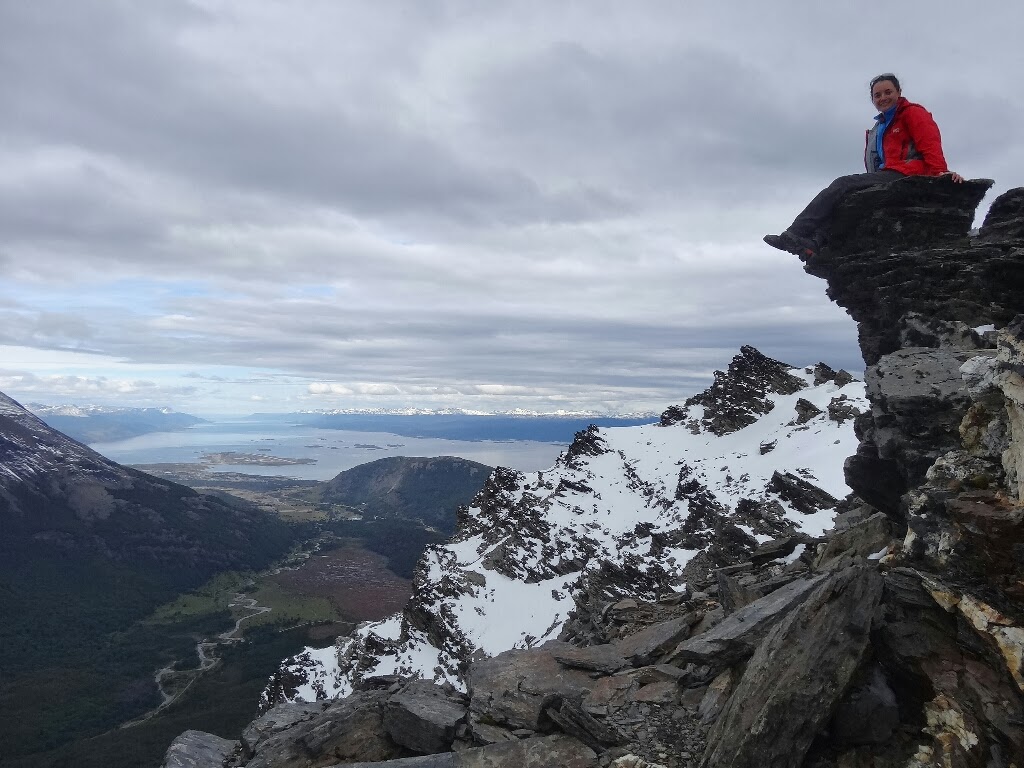 Puis nous montons jusqu'au "Cerro Guanaco" à 973 m d'altitude. La vue est vraiment spectaculaire. De part et d'autre de la montagne où on se trouve, il y a deux immenses vallées, on voit Ushuaia et le canal de Beagle et partout autour des montagnes.