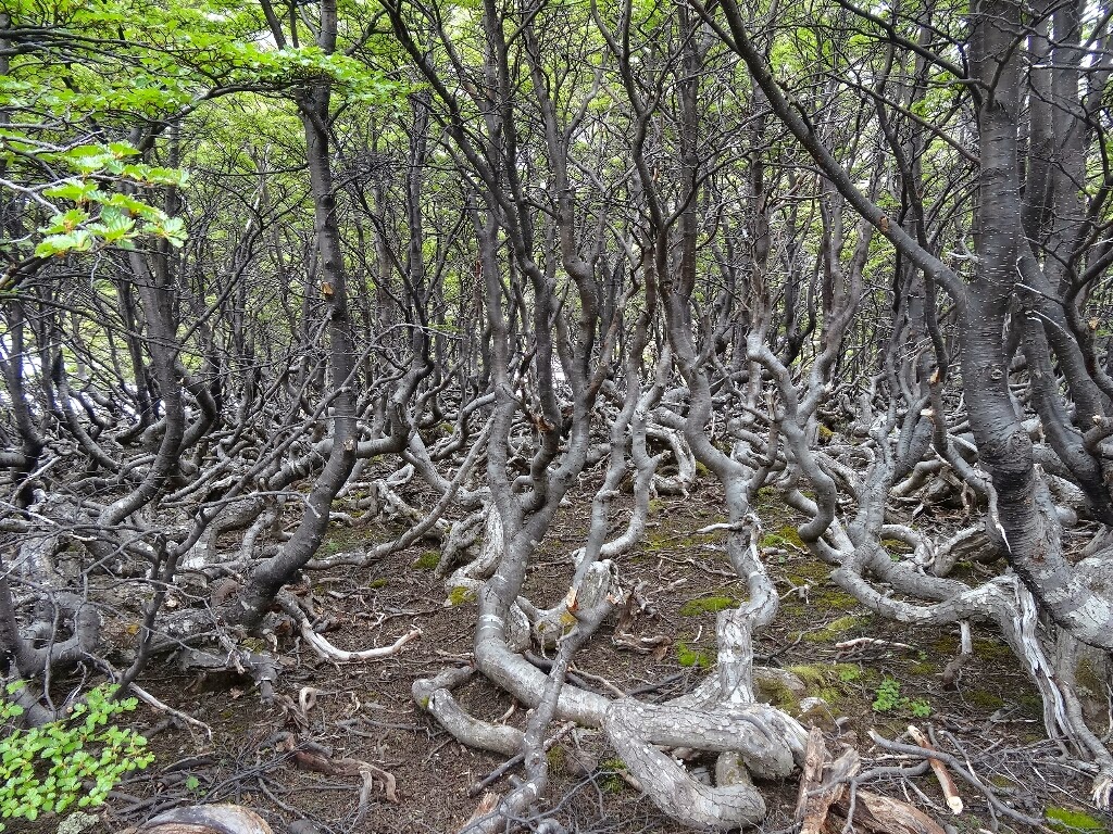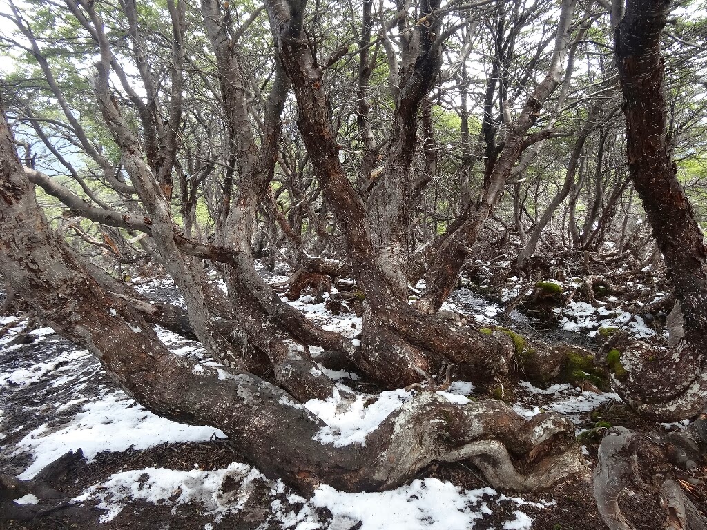Le chemin de descente passe à travers une forêt de hêtres torturés par le vent et les conditions climatiques difficiles de cette région. La limite de la forêt se situe vers 500 ou 600 mètres d'altitude ici.