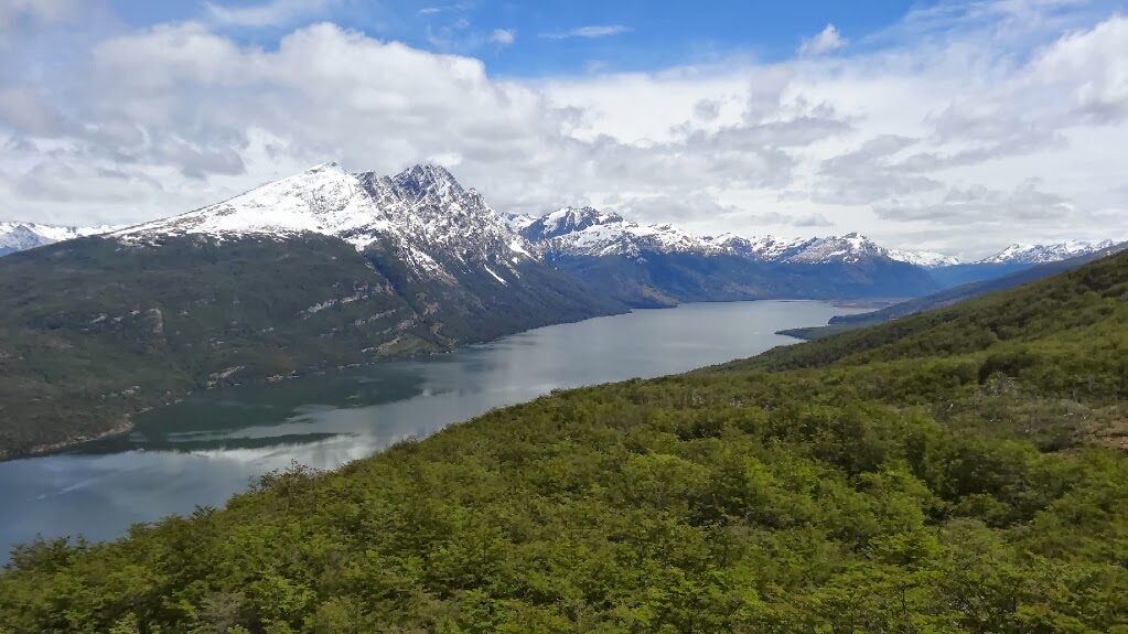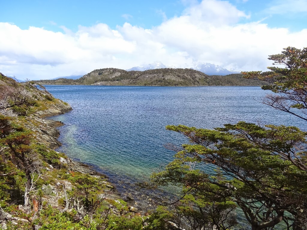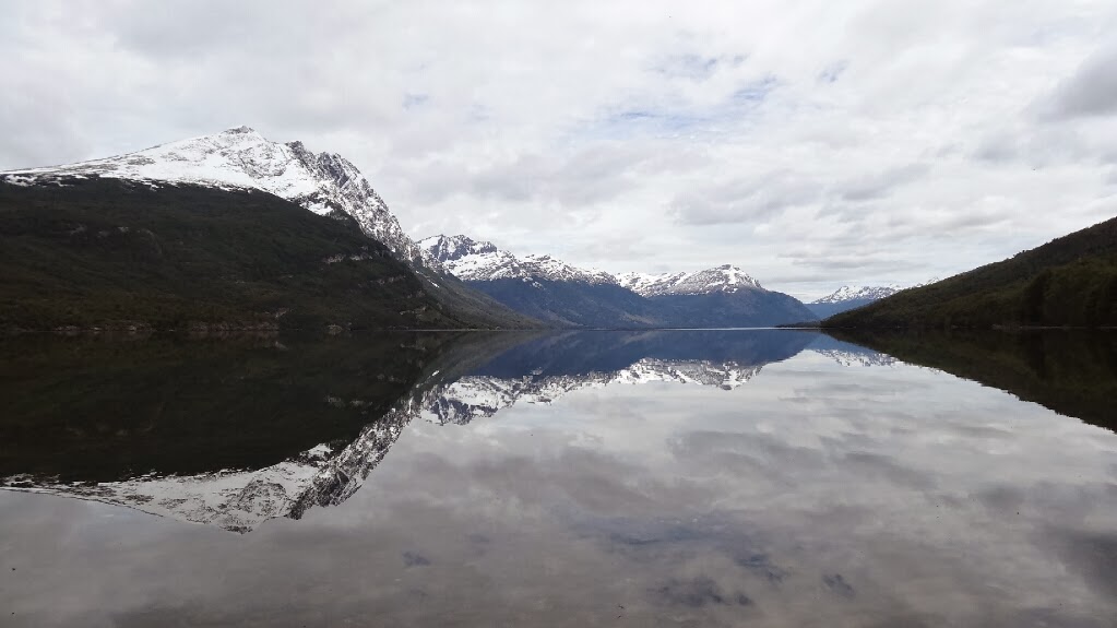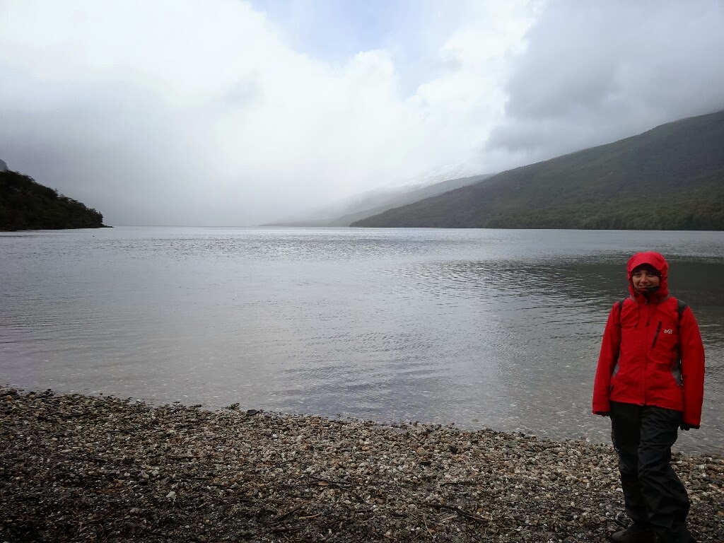 Le lendemain, le ciel est dégagés, on voit le sommet des montagnes alentours. Pour comparer, voici deux photos prises au bord du lago Roca, hier et aujourd'hui.