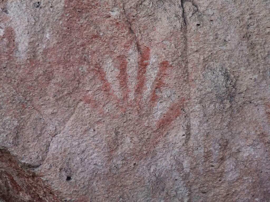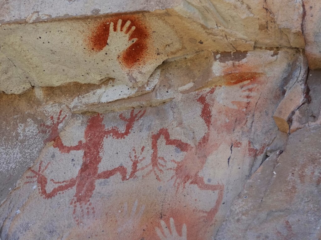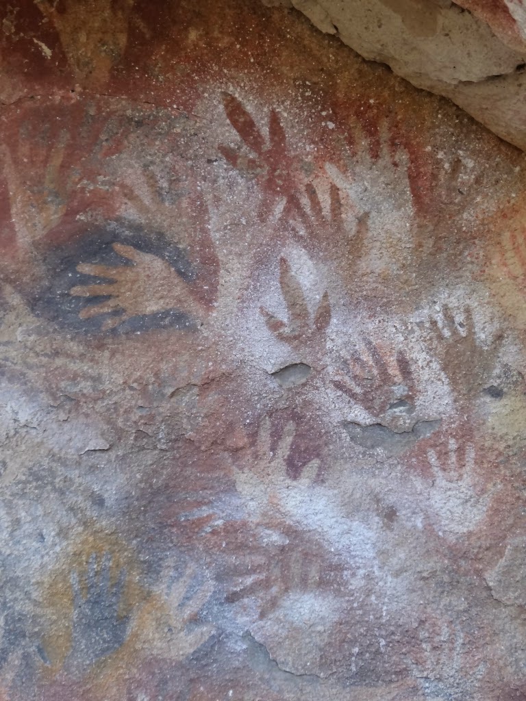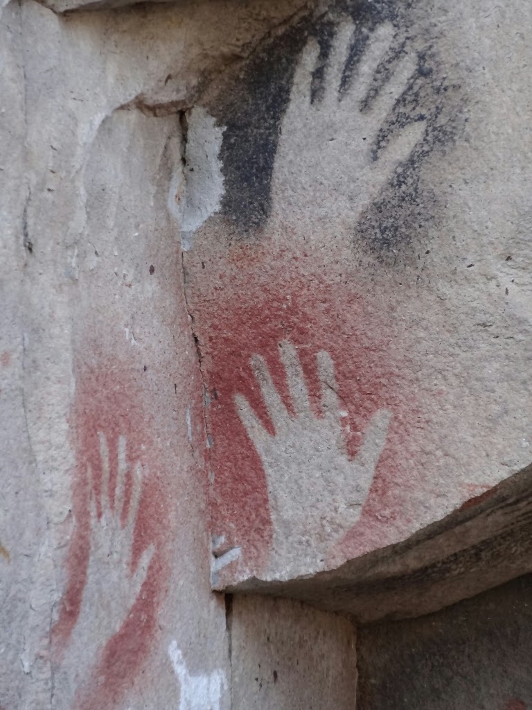 Puis nous remontons de l'autre côté où se trouve l'entrée du site. De là une visite guidée est organisée le long de la falaise où se trouvent des peintures rupestres datant de 8000 ans avant Jésus-Christ à 1000 ans ap-JC. Des groupes humains ont occupé ce canyon durant 9000 ans. On trouve les fameuses traces de mains.