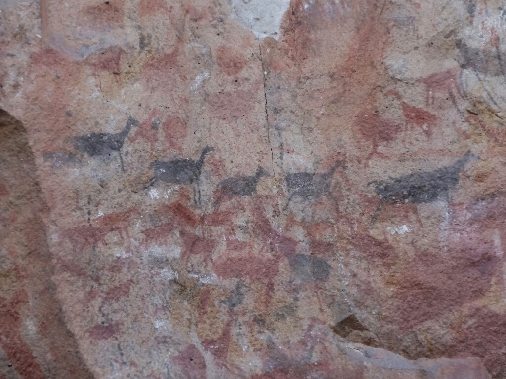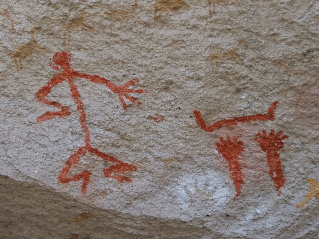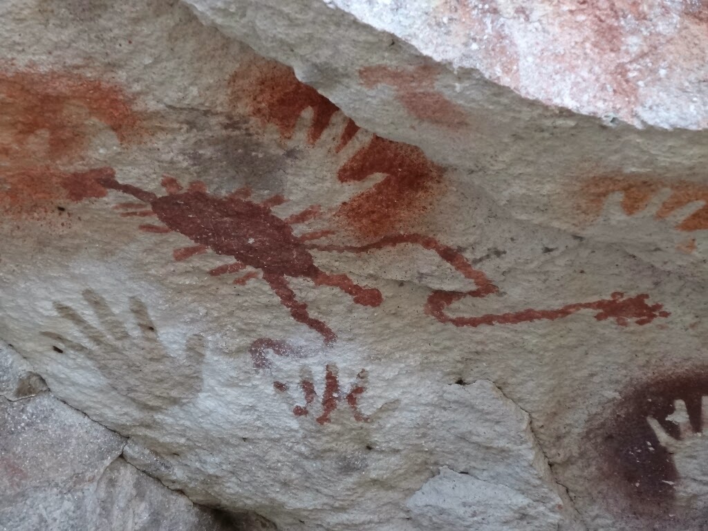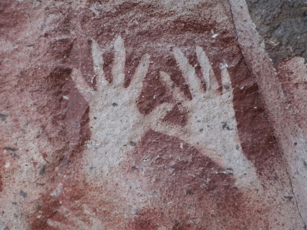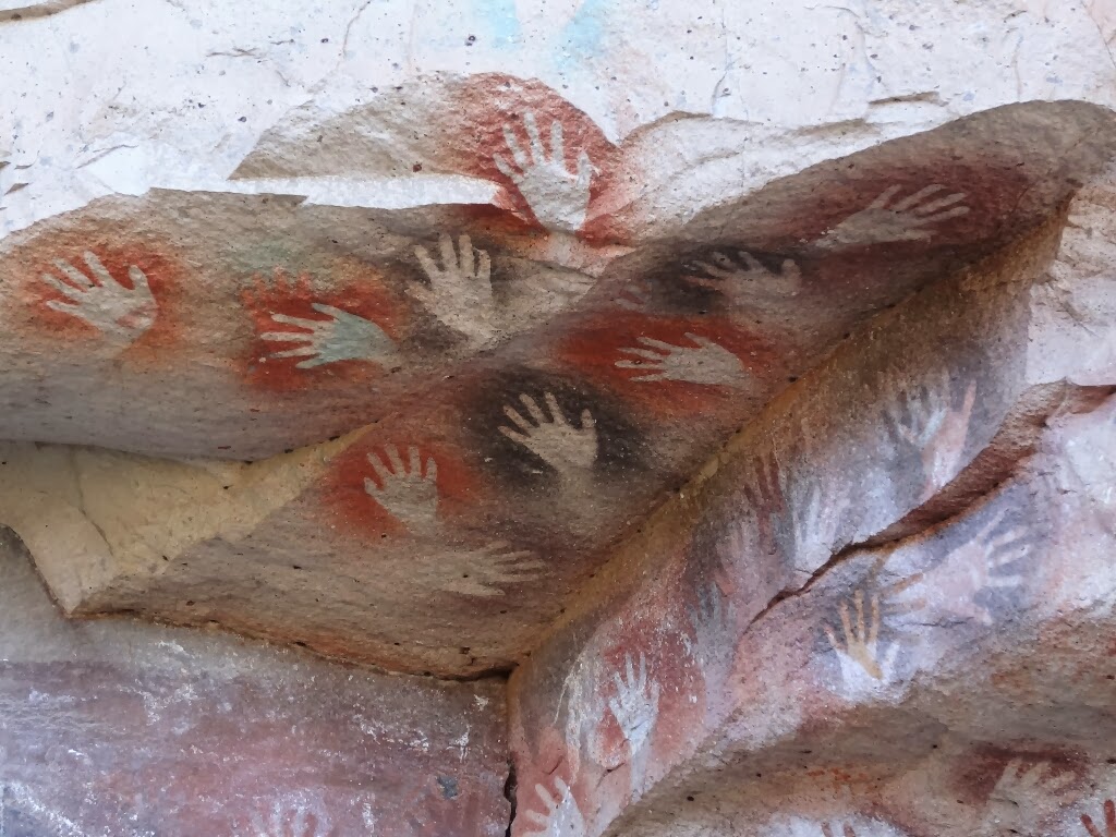 Puis nous remontons de l'autre côté où se trouve l'entrée du site. De là une visite guidée est organisée le long de la falaise où se trouvent des peintures rupestres datant de 8000 ans avant Jésus-Christ à 1000 ans ap-JC. Des groupes humains ont occupé ce canyon durant 9000 ans. On trouve les fameuses traces de mains.