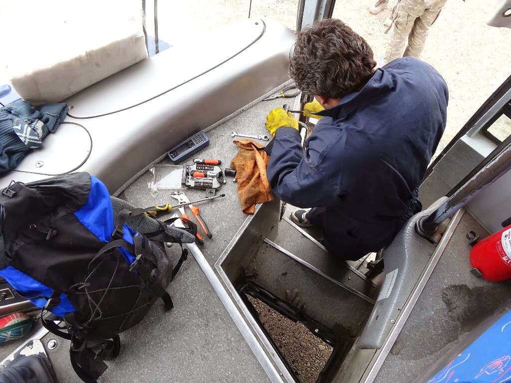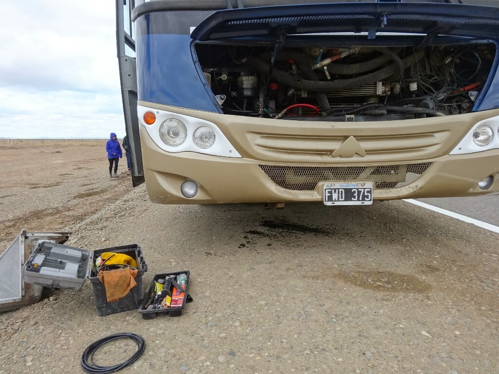 A 13h30, le bus s'arrête sur le bas côté, les chauffeurs baragouinent quelque chose, un passager israélien fait la traduction en hébreux, on est bien avancé. Au bout de quelques minutes on comprend qu'il y a un problème avec le bus et c'est en voyant un des chauffeurs enfiler un bleu de travail et un autre sortir le téléphone satellite qu'on comprend que nous sommes en panne. Sous le moteur, de l'huile goutte.