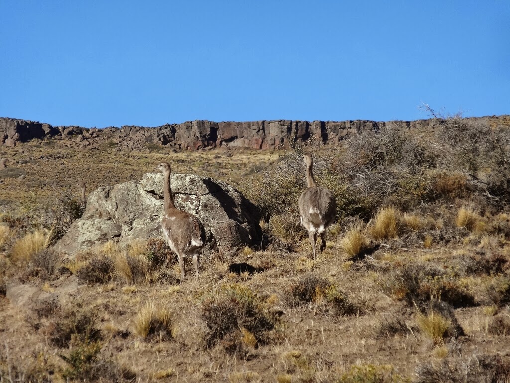 Nous faisons halte à Perito Moreno dans le but d'aller voir la "Cueva de los Manos", site de peintures rupestres classé à l'Unesco, situé à environ 1h de route de la ville dans un canyon. Il y a une excursion qui part de cet hôtel à 7h30. Il n'y a pas grand chose à faire dans cette ville et nous ne sommes pas trop fatigués, alors c'est parti. On traverse la pampa jusqu'au bord du canyon. En route, il y a des guanacos et des choiques (espèce voisine du nandou).