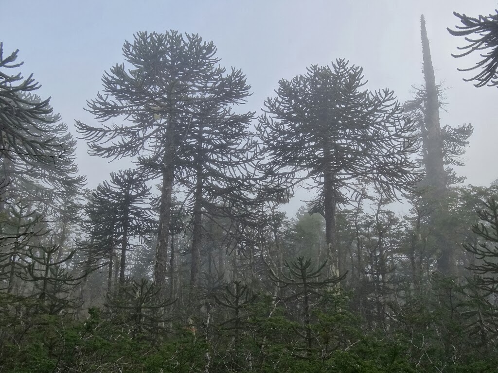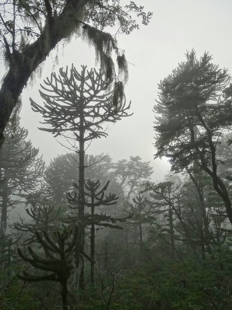 Le lendemain, on se lève tôt, il y a un peu de brouillard mais on n'aperçoit le ciel bleu au travers. La brume et les araucarias forment une ambiance très particulière.