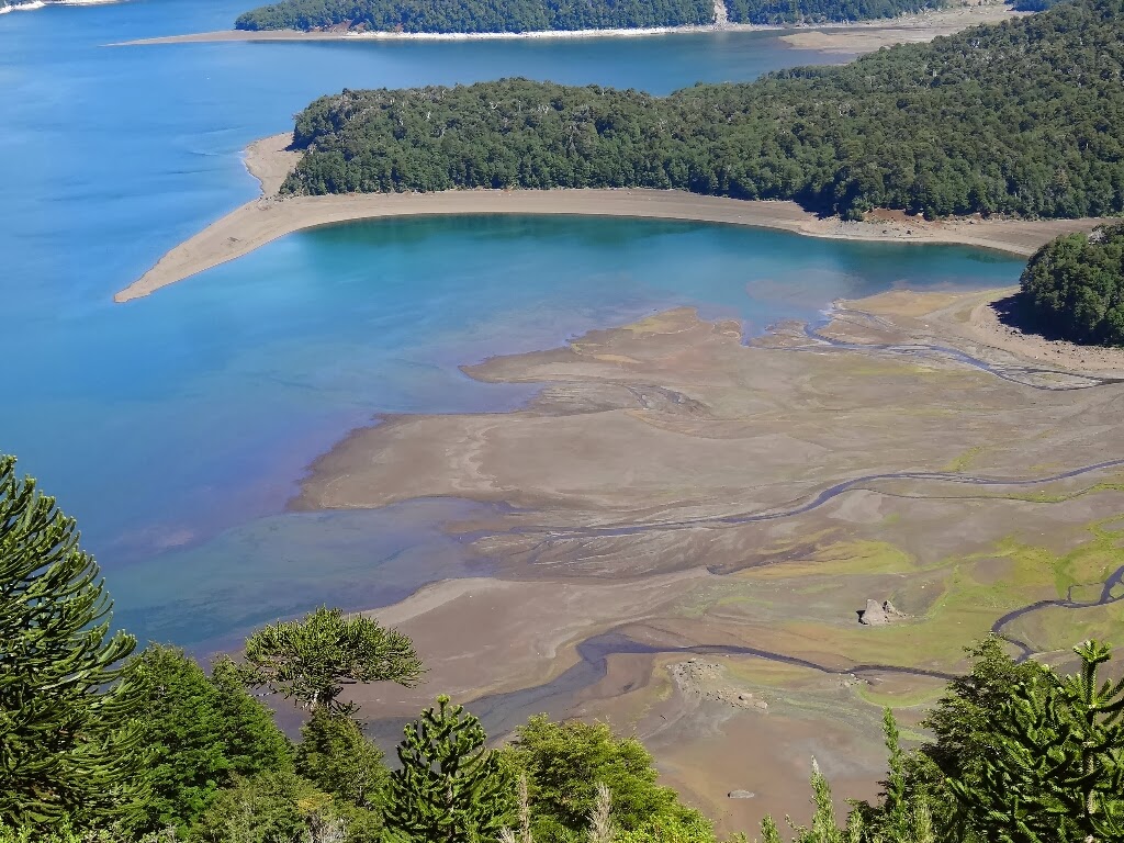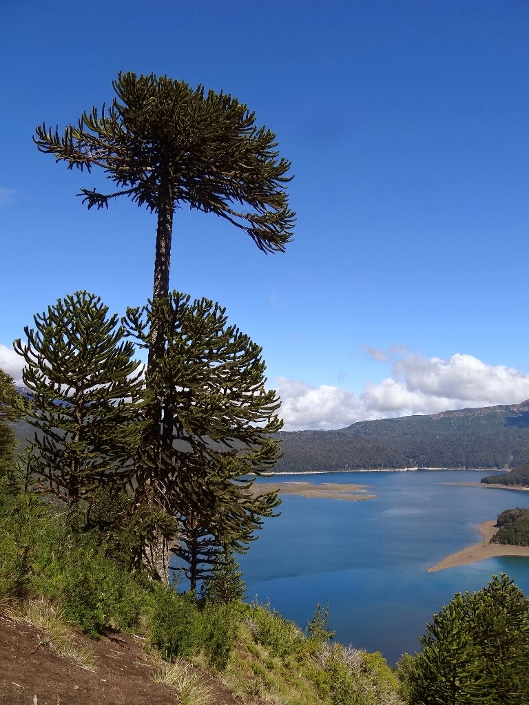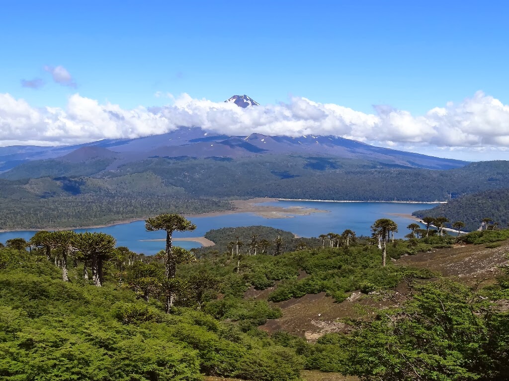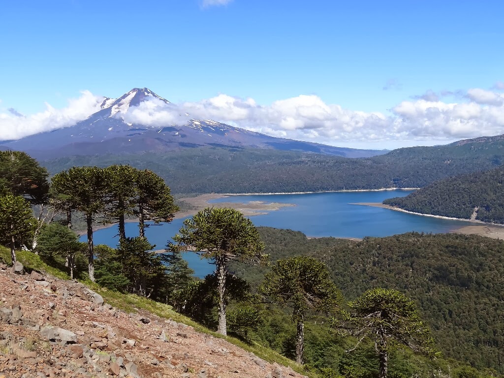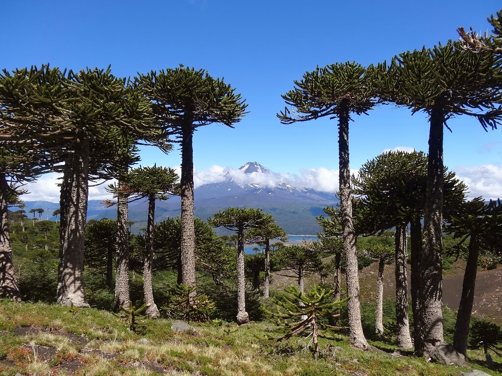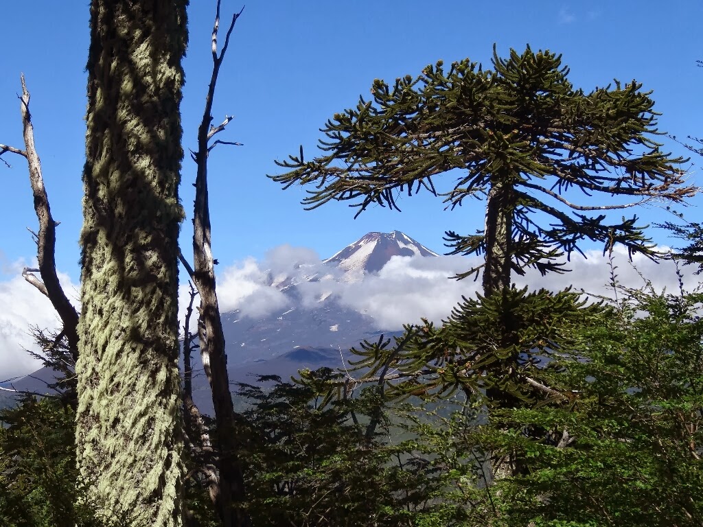 Nous prenons de la hauteur et atteignons une crête de laquelle nous avons de superbes points de vue sur le lac Conguillio, les araucarias et le volcan Llaima culminant à 3125m.
