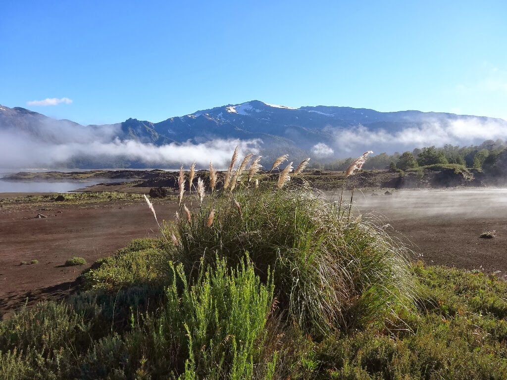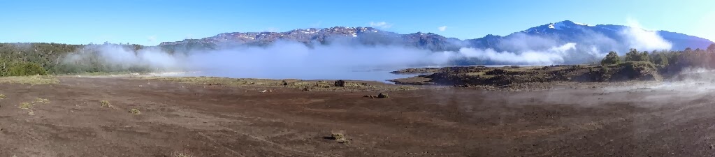 Nous partons pour la randonnée de la Sierra Nevada. Nous marchons d'abord le long du lac Conguillio. Le brouillard qui le recouvre se dissipe peu à peu.