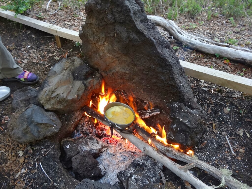 Le soir, au menu du diner, c'est omelette cuite au feu de bois, qui finie pour moitié en oeufs brouillés, et pour l'autre en oeufs collés au fond du plat.
