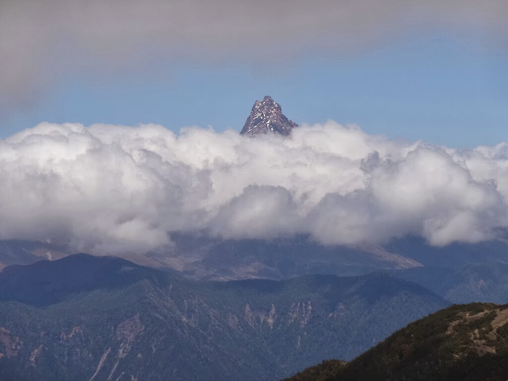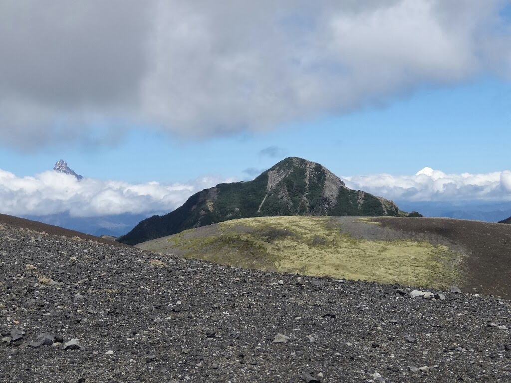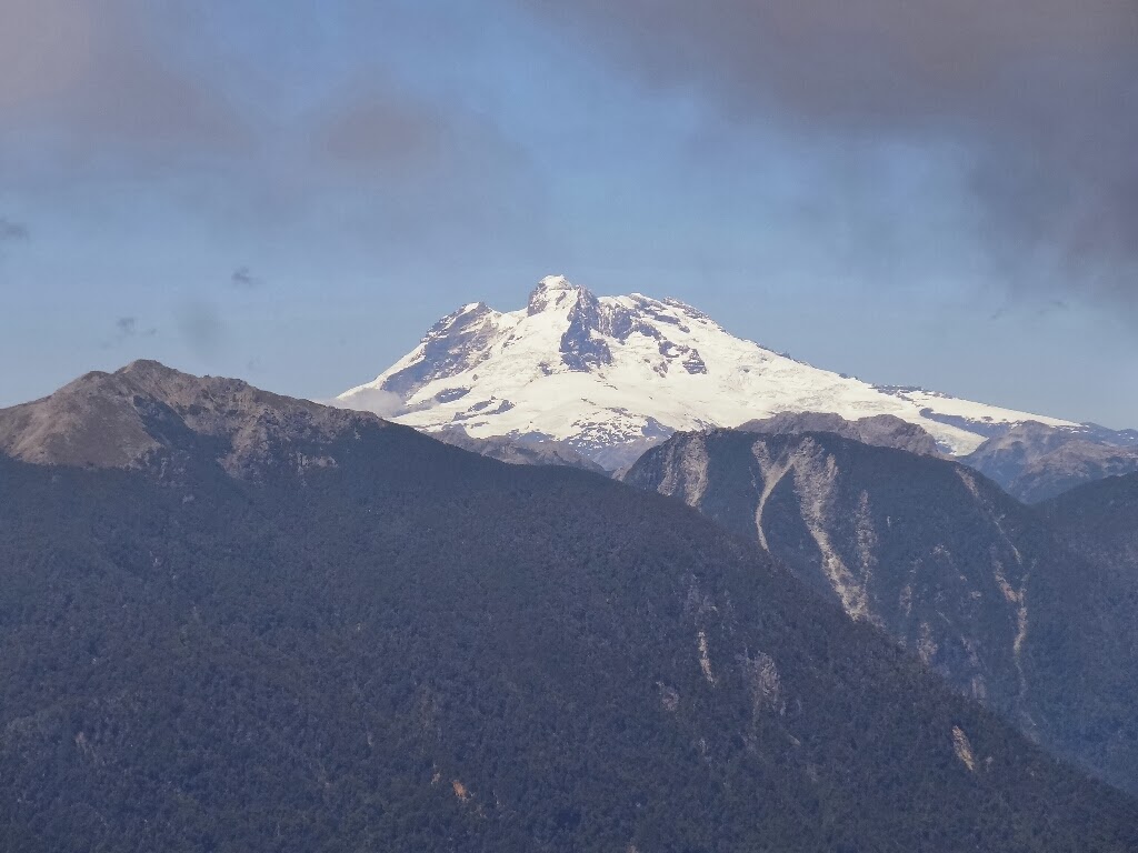 Puis nous montons jusqu'au point de vue. Les nuages sont quelques mètres au-dessus de nous. Le volcan le plus proche, le Casablanca, se cache, les sommets des volcans Osorno et Puntiagudo dépassent à peine, mais le gros volcan Tronador est parfaitement visible, la vue d'ensemble est superbe.