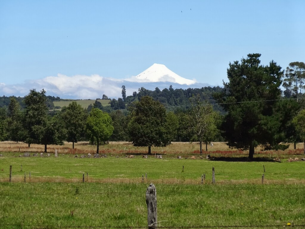 Vue sur le volcan Osorno et la campagne. La région, très agricole, produit beaucoup de framboises, au grand bonheur d'Edith.