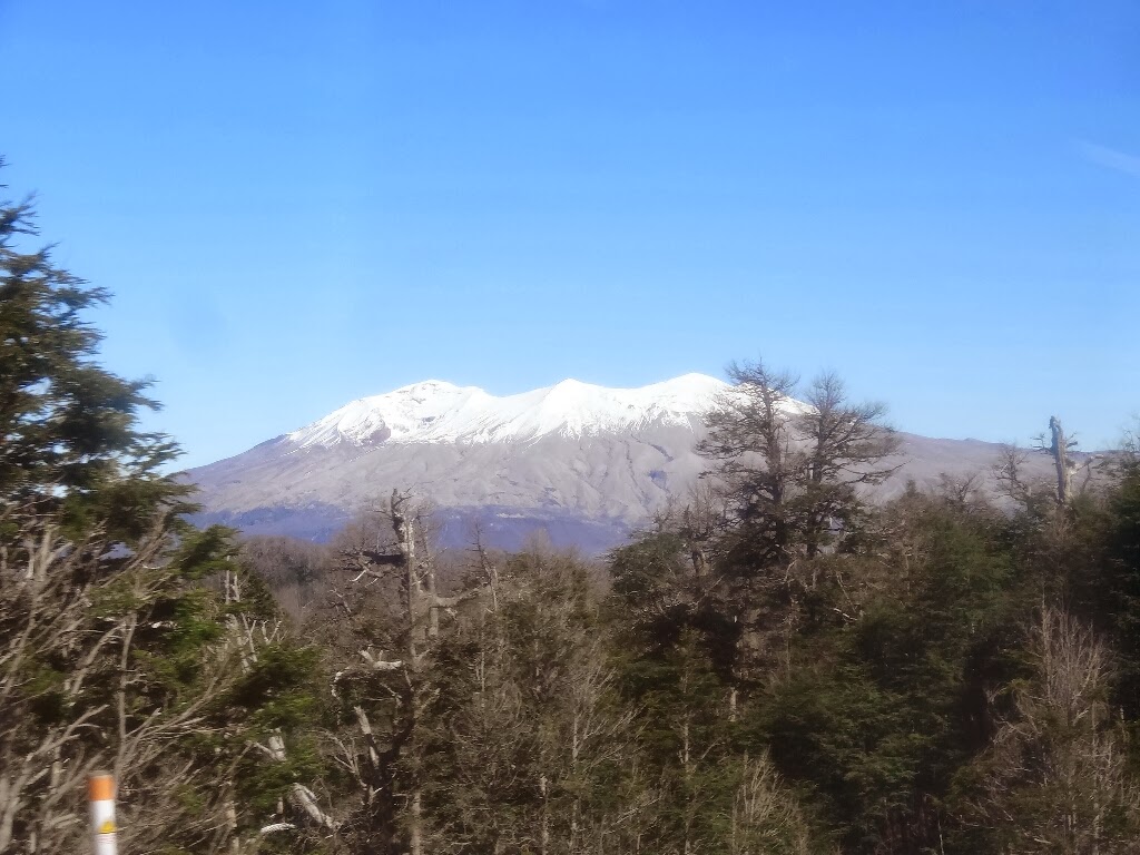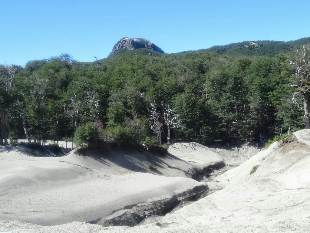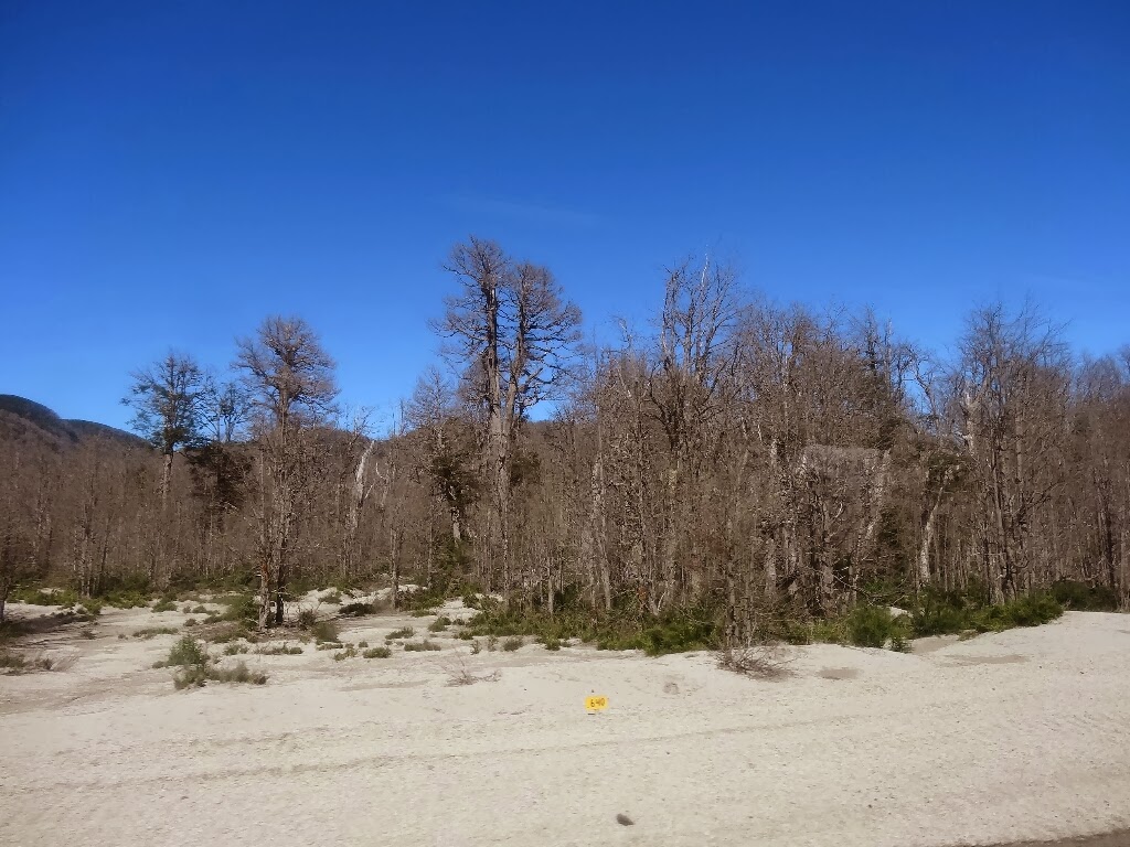 En chemin, nous traversons une région dévastée par l'éruption du volcan Puyehue en 2011. Beaucoup d'arbres sont morts et une épaisse couche de cendre recouvre le sol.