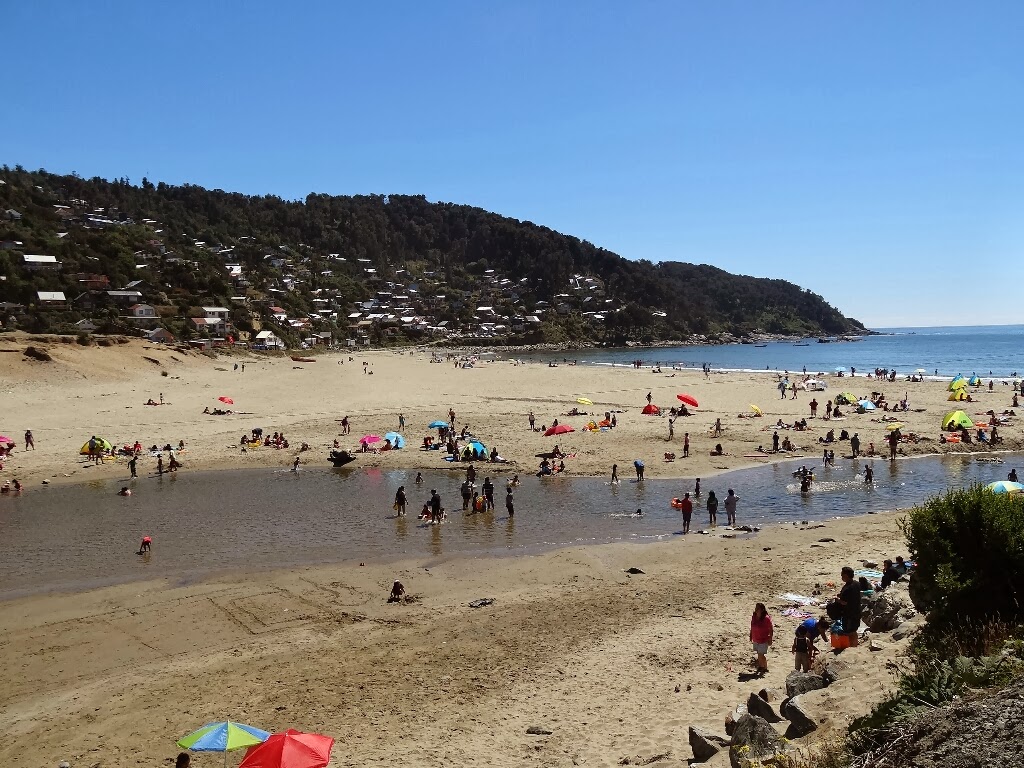 Puis nous prenons un bus jusqu'à Maicolpue. A notre arrivée nous trouvons un village très touristique et une plage bondée de chiliens. On cherche des infos pour se rendre à "Caleta Condor". On ne trouve pas de bureau d'information. On s'adresse à une personne qui tient une baraque à frites et qui a des prospectus pour une agence qui fait des tours en bateau. Nous sommes apparemment que deux à vouloir aller à Caleta Condor demain, du coup le trajet est très cher. On renonce finalement à s'y rendre. L'ambiance n'est pas vraiment ceux à quoi on s'attendait.
