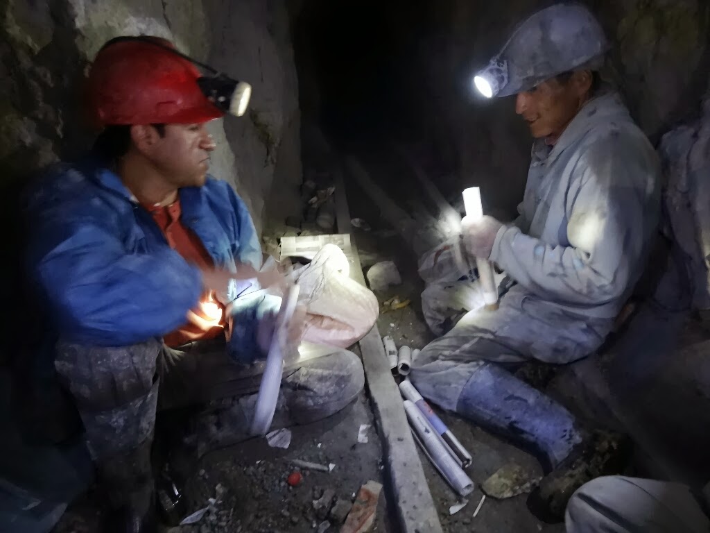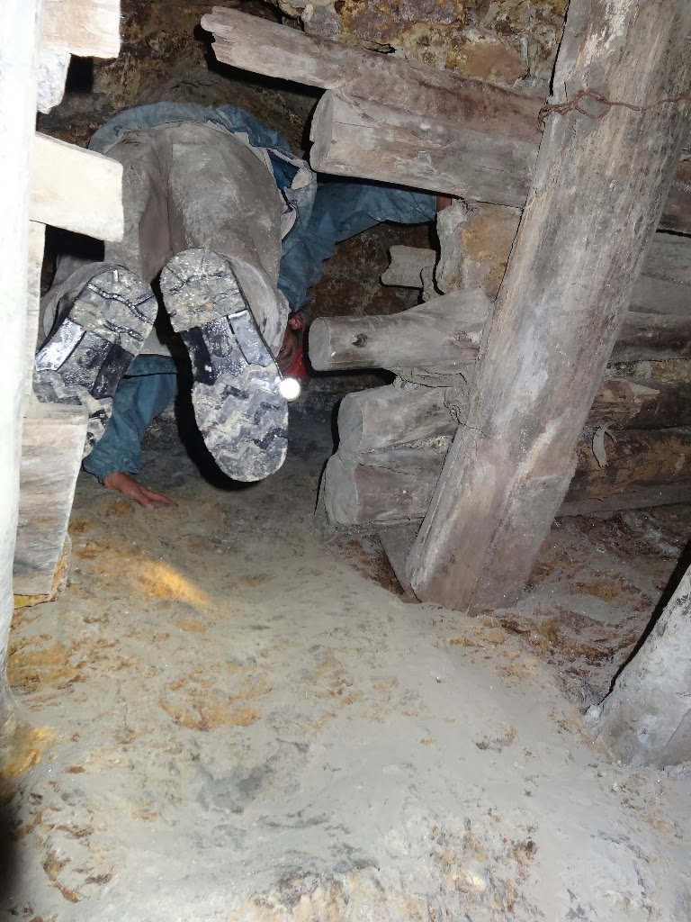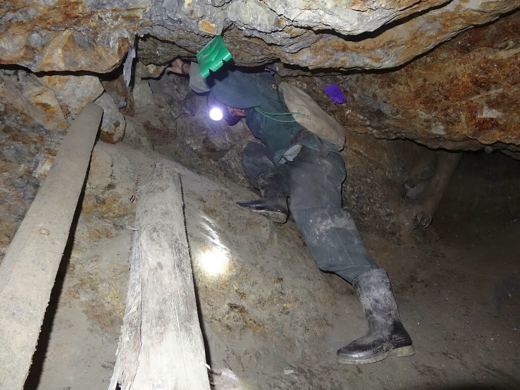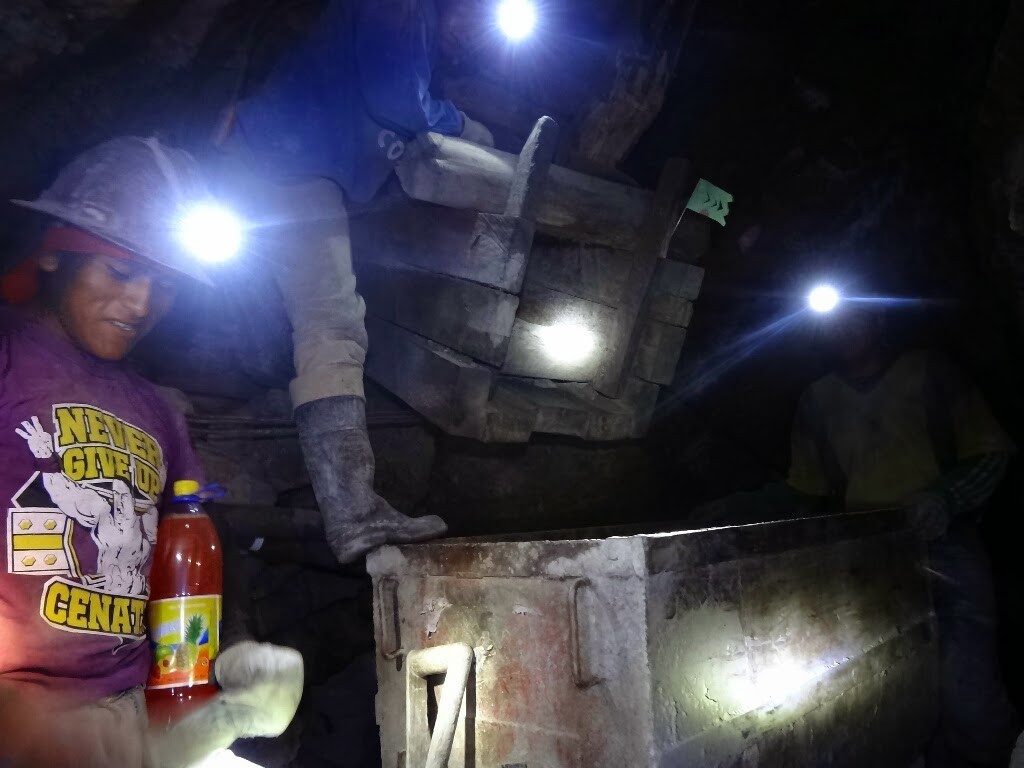 On s'engage dans une plus petite galerie. Ici le filon est exploité à la verticale, il faut escalader et se faufiler pour atteindre le front de taille. Nous rencontrons Gabriel qui travaille à casser du minerai au marteau, sans lunette. Cette zone est étroite, poussiéreuse, il y fait chaud et l'air se fait rare. Le guide nous dit que parfois du monoxyde de carbone provenant de la montagne envahit un secteur. Ils n'ont aucun détecteur de ce gaz mortel et inodore. Lorsqu'ils ne se sentent pas bien, que la tête se met à tourner, c'est le signal que le gaz arrive, il faut vite évacuer.