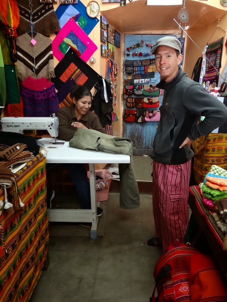 Boris a un petit problème de pantalon, deux gros trous aux fesses, résultat de 8 mois de bourlingage. Une marchande d'artisanat, qui est aussi couturière, pose deux pièces de tissus solide aux fesses du pantalon qui est maintenant bon pour faire un deuxième tour du monde ! La marchande rigole bien, elle ne doit pas avoir ce genre de demande tout les jours.