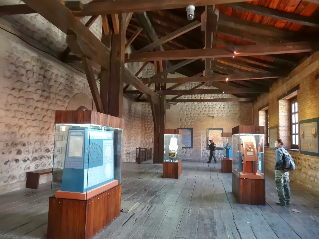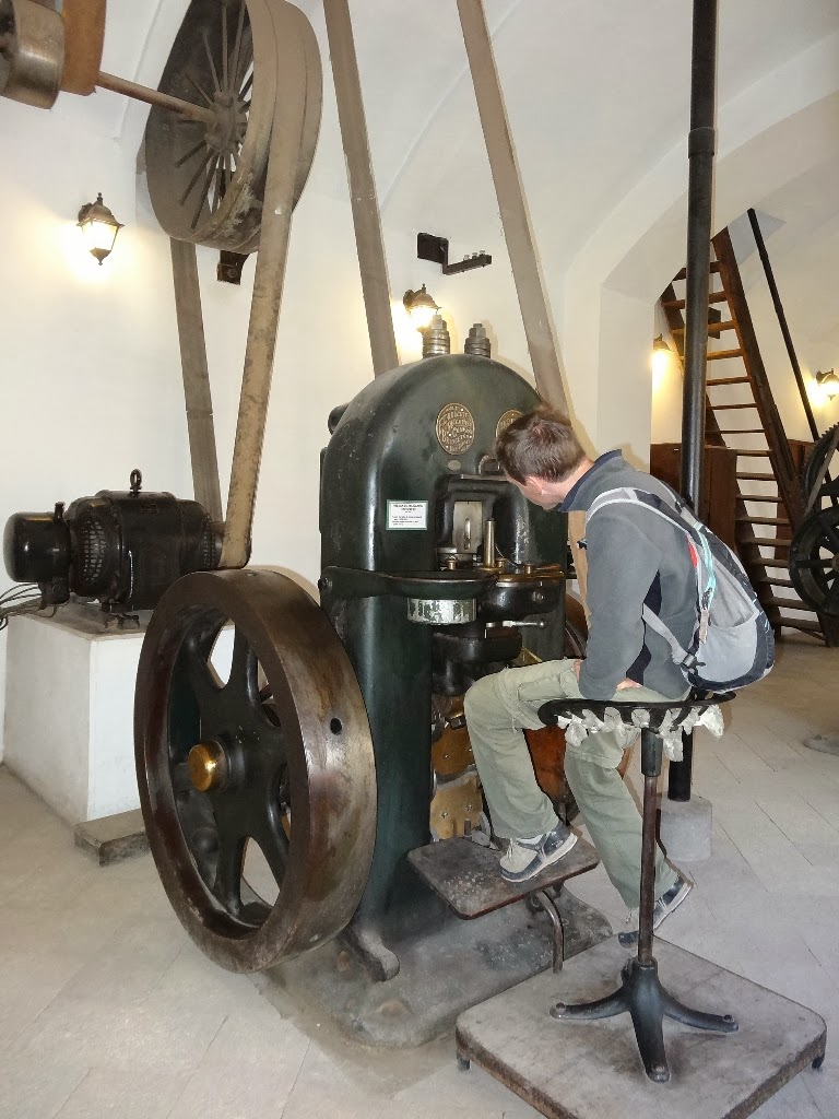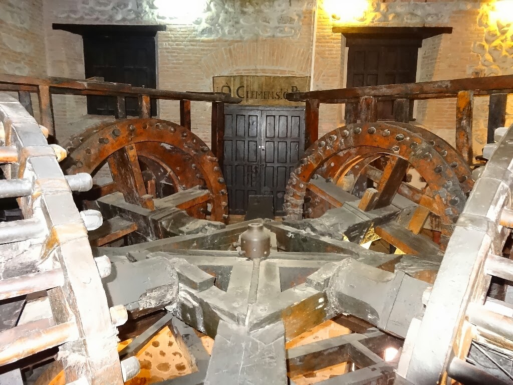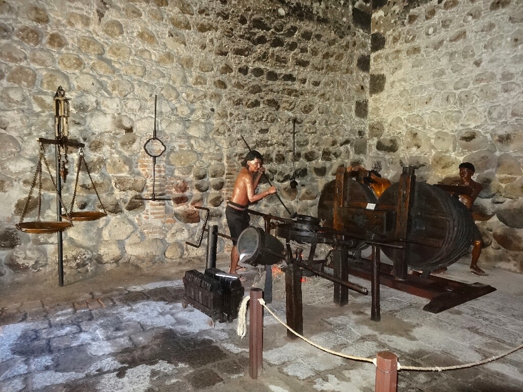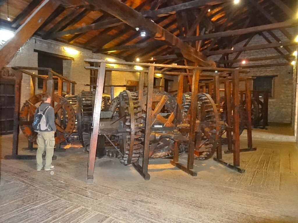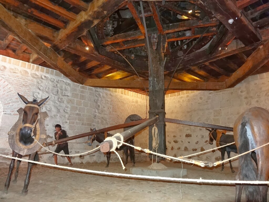 Système pour laminer (affiner) les lingots d'argent à l'épaisseur des pièces. L'énergie est fournie par des ânes. A l'étage au-dessus se trouve un système d'engrenages en bois qui permet d'activer deux cylindres en métal dont l'écartement est légèrement plus fin que le lingot. Douze paires de cylindres de plus en plus rapprochés permettent d'obtenir l'épaisseur d'argent voulu.