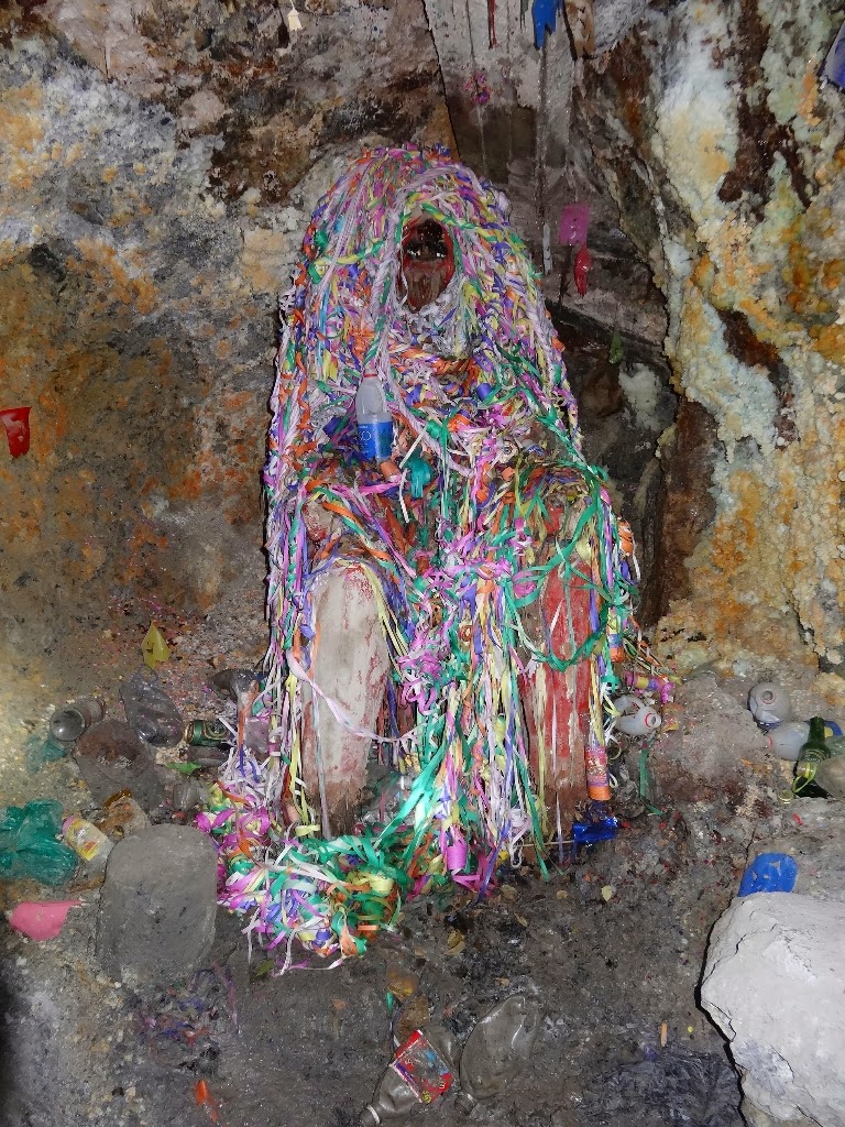 Puis le guide nous amène dans un recoin ou réside El Tio (le diable). Les mineurs croient que le monde souterrain est sa demeure. Le diable, en s'accouplant avec Pachamama (la terre mère), a produit les filons d'argent. Les mineurs lui font des offrandes (alcool, coca, cigarettes) pour ne pas réveiller sa colère, éviter ainsi les accidents et trouver de bons filons. Au moment du carnaval ils le recouvrent de cotillons.
