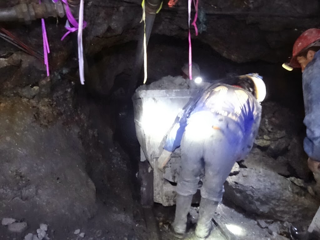 Quelques centaines de mètres plus loin, on croise un wagonnet plein de roche qui se dirige vers la sortie. Deux gars le retiennent, la galerie est en légère pente, ça à l'air très lourd, il n'y a pas de freins. Le guide nous dit que c'est un poste dangereux et très fatigant. Les gars peuvent se faire rouler dessus et ils n'ont pas de chaussures de sécurité bien entendu. Si le wagonnet leur échappe, ils prend de la vitesse et rien de l'arrête. Dans ce cas, il faut vite trouver un abris hors de sa trajectoire, et c'est pas facile dans cette galerie étroite.