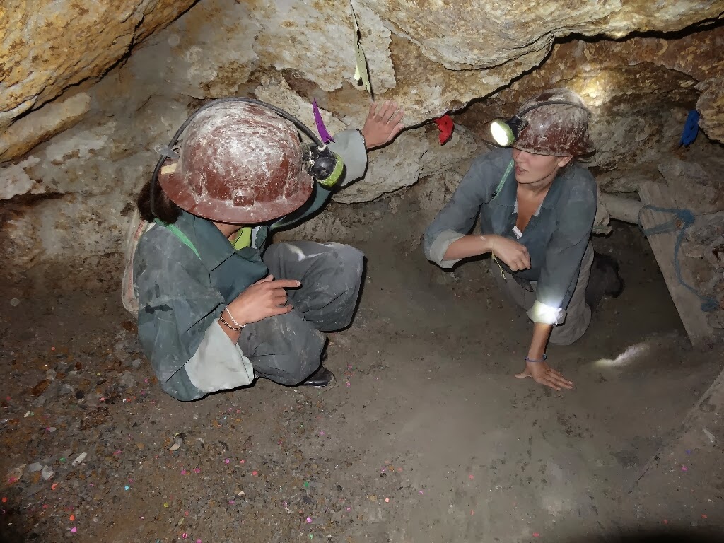 On s'engage dans une plus petite galerie. Ici le filon est exploité à la verticale, il faut escalader et se faufiler pour atteindre le front de taille. Nous rencontrons Gabriel qui travaille à casser du minerai au marteau, sans lunette. Cette zone est étroite, poussiéreuse, il y fait chaud et l'air se fait rare. Le guide nous dit que parfois du monoxyde de carbone provenant de la montagne envahit un secteur. Ils n'ont aucun détecteur de ce gaz mortel et inodore. Lorsqu'ils ne se sentent pas bien, que la tête se met à tourner, c'est le signal que le gaz arrive, il faut vite évacuer.