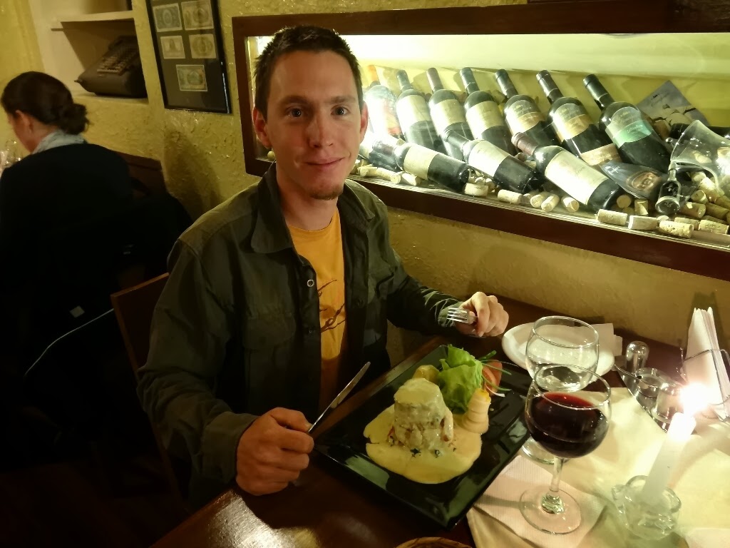 Pour l'occasion nous allons dans un bon restaurant. Quoi de mieux pour se faire plaisir qu'un bon repas français, et oui ça nous manque un peu. Ici on a la chance de trouver un resto tenu par un chef français. Au menu : en apéro vin blanc puis filet de boeuf sauce roquefort pour Boris, sauce au vin et champignons pour Édith accompagné de vin rouge. La viande est super tendre et vraiment délicieuse. Au dessert, mousse au chocolat. Là on a explosé le budget : 25€ pour deux, alors qu'on mage habituellement pour 3 à 8€. Mais on a 30 ans qu'une seule fois dans sa vie, au diable l'avarice.