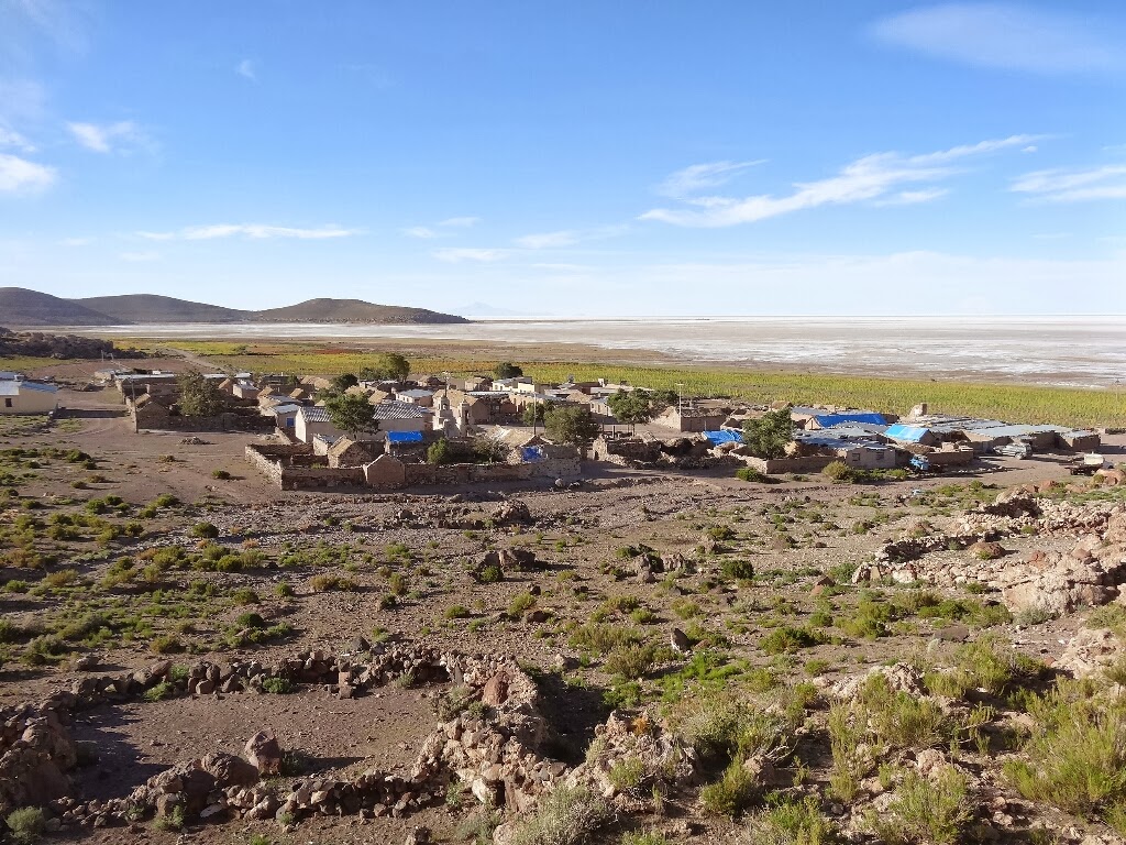 Notre itinéraire suivant va dépendre des conditions sur le salar de Uyuni : soit il y a trop d'eau (nous sommes en fin de période des pluies) et nous devons contourner le salar pour aller jusqu'à Uyuni et revenir ensuite sur le salar, soit il n'y a pas trop d'eau et nous pouvons le traverser. Nous arrivons dans un village en bordure du salar, l'hôtel est ouvert c'est plutôt bon signe, Jésus va se renseigner. Demain, nous pourrons passer sur le salar sans faire le tour.