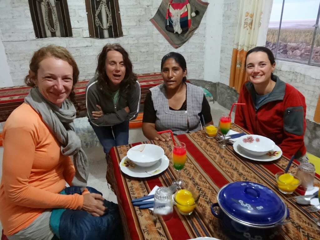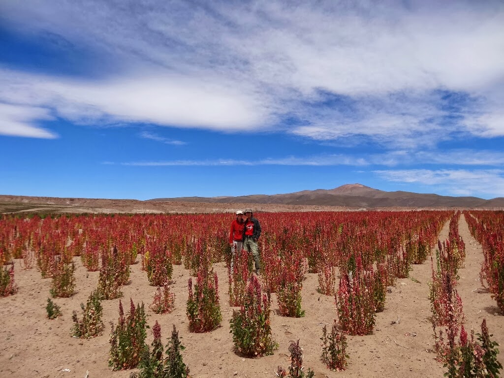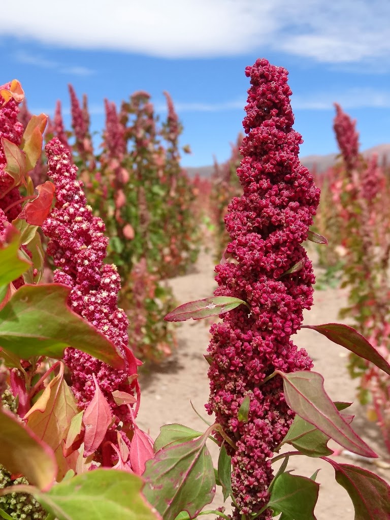 Nous reprenons la route et croisons de nombreux champs de quinoa. Certains sont rouges, d'autres jaunes, cela dépend de la variété. On apprend que presque tout le quinoa produit en Bolivie est exporté car son prix de vente est très intéressant pour les agriculteurs, et il monte d'année en année. Par contre les boliviens en mangent de moins en moins.