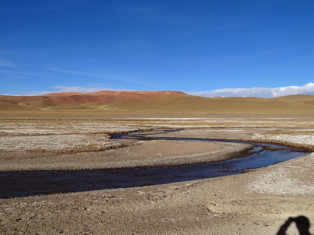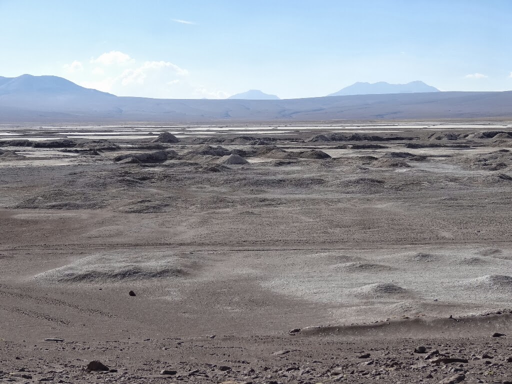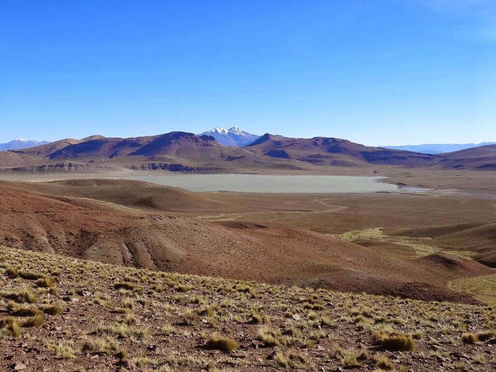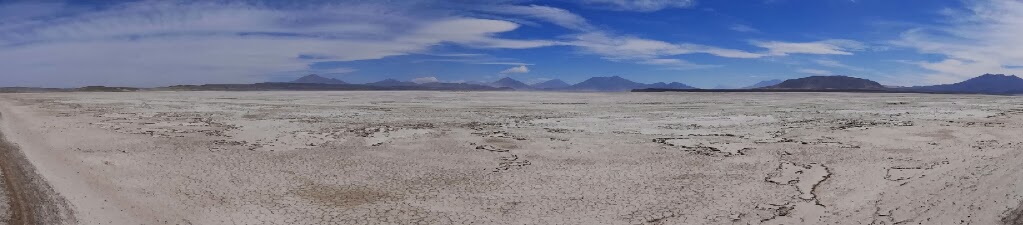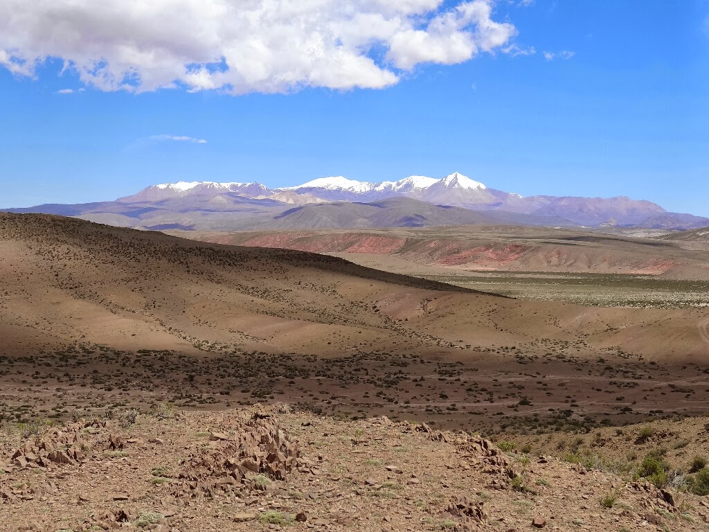 Après le repas nous partons tous les deux marcher un peu le long de la piste. Arrive en face une femme assez âgée qui marche, tout en tricotant une chaussette, on discute un peu. Elle est partie depuis 7h du matin, elle va au prochain village (jolie rencontre mais pas de photo car elle n'a pas voulu). Les gens de cette région éloignée se déplacent beaucoup à pied, il est normal pour eux de marcher 5 ou 6 heures par jour. Le 4x4 nous récupère au passage, le paysage défile, au loin apparait le massif du Lipez enneigé.